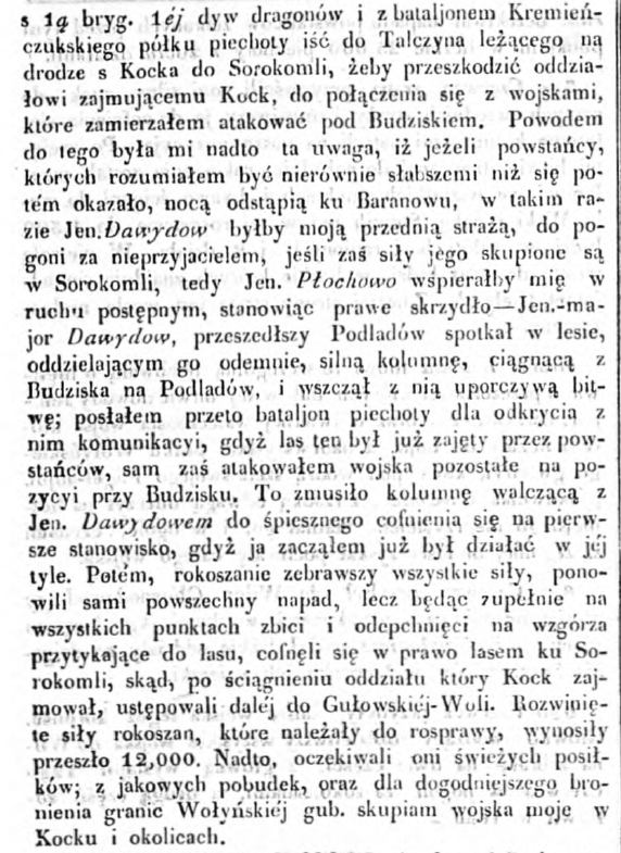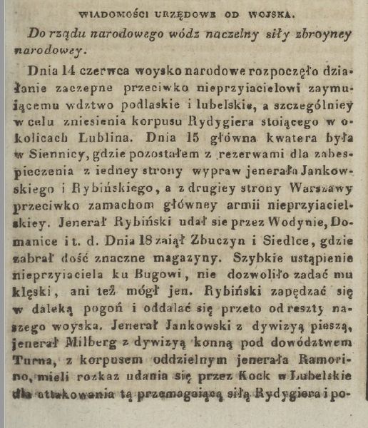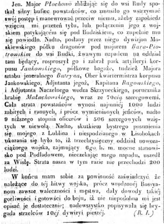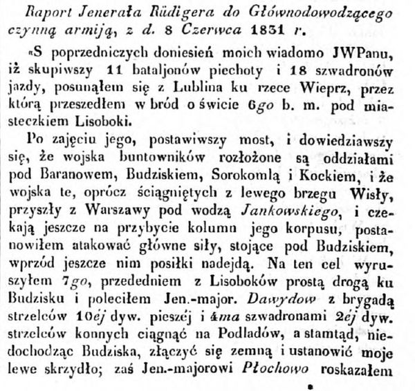 192 rocznica bitwy pod Łysobykami. Poniżej zamieściłam raport gen rosyjskiego Rudigera z dn. 8 czerwca 1831r. oraz informację gen. Jana Skrzyneckiego – głównodowodzącego wojskami polskimi skierowaną do Rządu Narodowego z 18 czerwca 1831r.