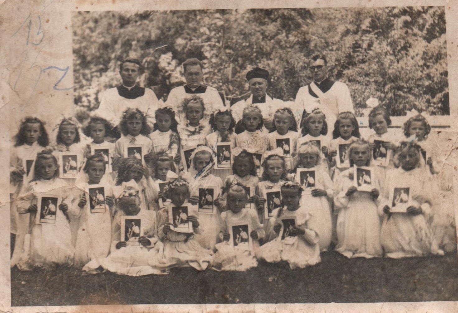 Zdjęcie zrobiono obok kościoła w Łysobykach w latach 50-tych. Proboszczem w latach 1947-1961 był Ewaryst Puchalski. Wśród księży od prawej: ks. Szymanek z Przytoczna, proboszcz ks. Ewaryst Puchalski. Nie wiem kim są pozostali księża. Wśród dziewczynek jest p. Maria Ziobroniewicz z Przzytoczna, czyli można wnioskować, iż widoczne za zdjęciu dzieci to dzisiaj ponad siedemdziesięcioletnie kobiety.