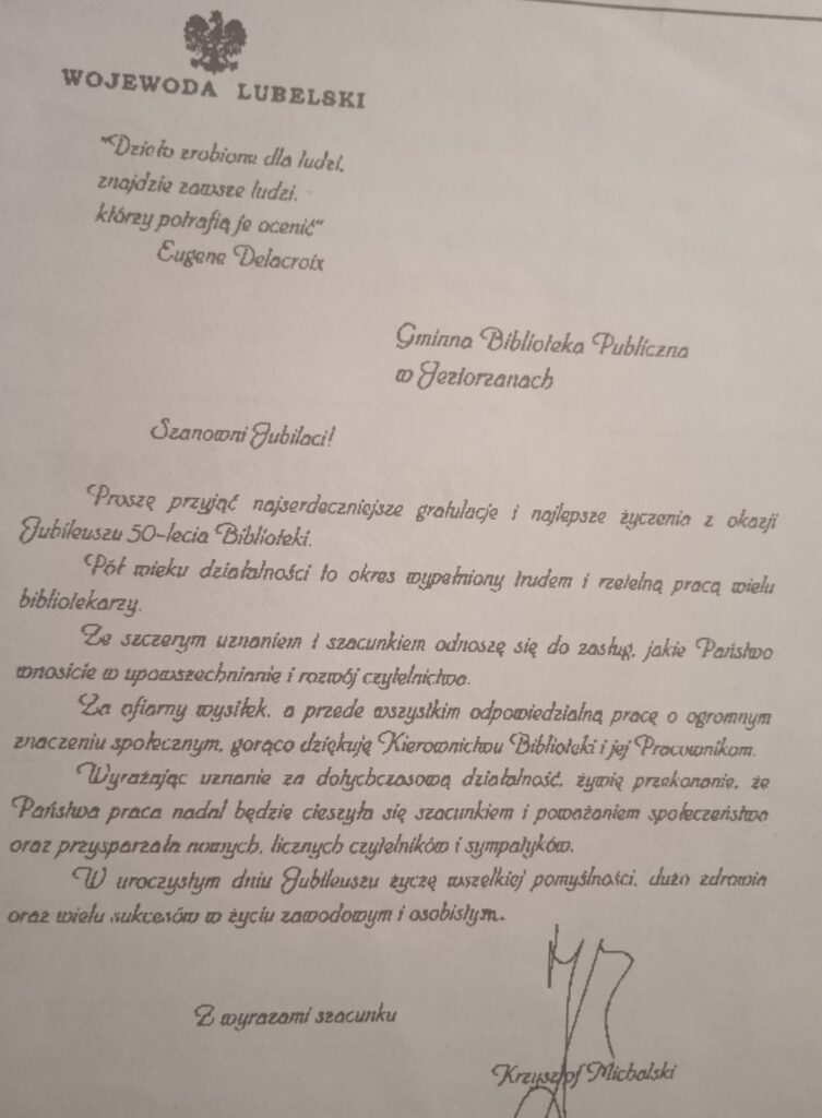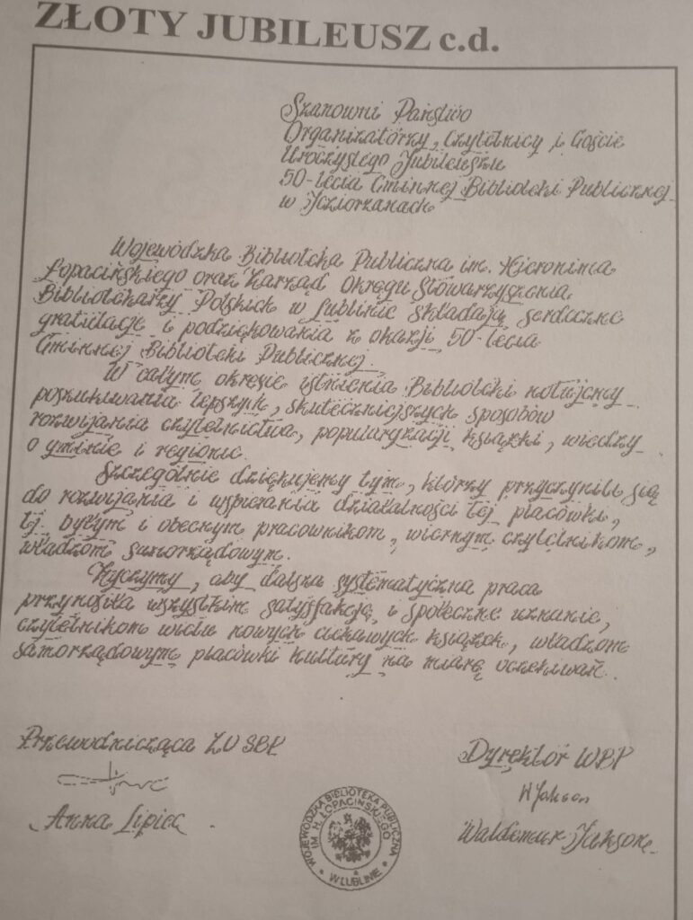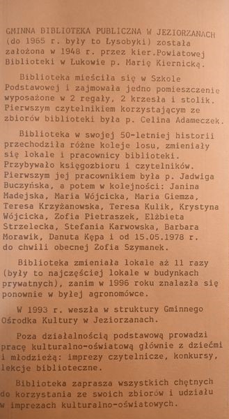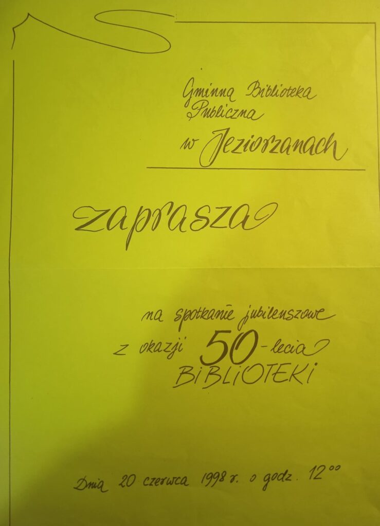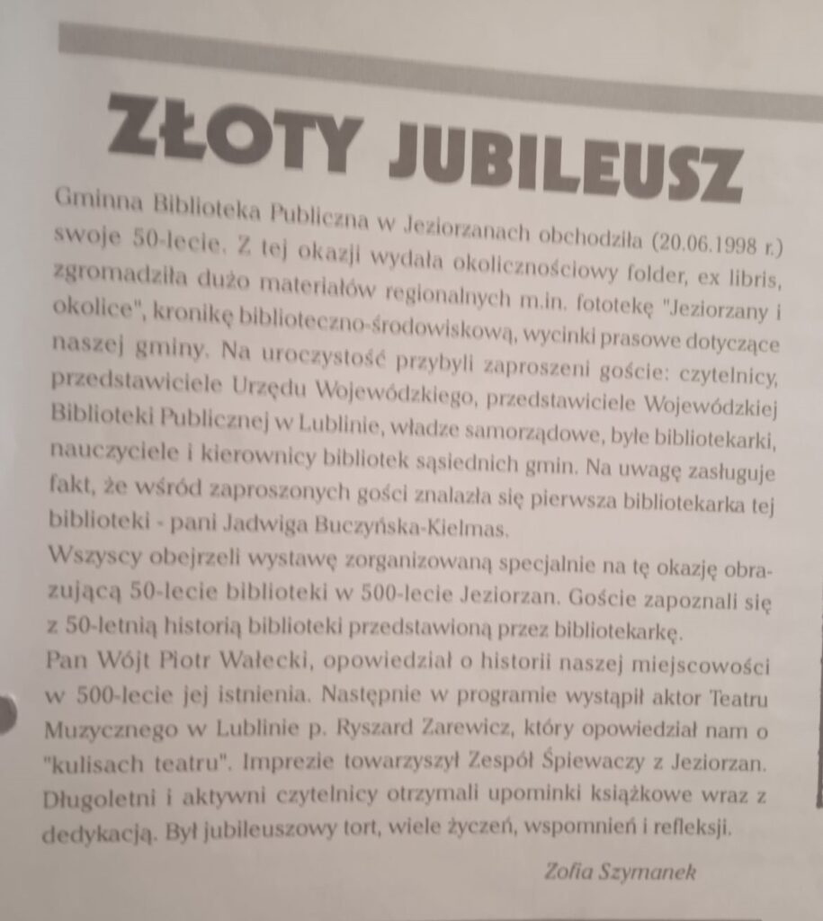 Główne uroczystości odbyły się 20 czerwca 1998r.w budynku zwanym Agronomówka przy ul. Blizockiej, gdzie w latach 90-tych mieściła się biblioteka. Z tej okazji pracownicy GOK przygotowali okolicznościowy folder, ukazujący historię Gminnej Biblioteki Publicznej w Łysobykach/Jeziorzanach. Wydano też Ex Libris, czyli znak własnościowy zawierający nazwę biblioteki. Zamieszczone zdjęcia ukazują m.in.: każdą stronę folderu, ex libris, informacje o spotkaniu jubileuszowym, gratulacje od wojewody i Wojewódzkiej Biblioteki Publicznej im. H. Łopacińskiego, artykuł „Złoty jubileusz” p. Zofii Szymanek. Poniżej zamieściłam przedruki artykułów, które ukazały się w nr 5 „Panoramy Gminy Jeziorzany”.