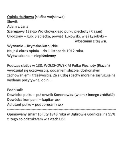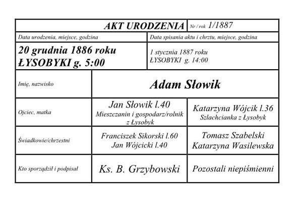 Niedawno otrzymałam dokument spisany w języku rosyjskim w 1911r. Obok tłumaczenie na język polski i wypis z aktu urodzenia osoby, która jest wymieniona w dokumencie. Na uwagę zasługuje wpis odnośnie rodziców Adama Słowika. Ojciec wpisany jest jako mieszczanin, a matka jako szlachcianka. Mieszczanin, szlachcianka to relikty jeszcze wtedy żywe z czasów, gdy Łysobyki były miastem. Jeszcze w latach 60-tych, a nawet 70-tych dwudziestego wieku niektórzy mieszkańcy Jeziorzan mówili „chamy do siana jadą”. Chamy, czyli chłopi ze wsi. Mieszkańcy Jeziorzan nadal uważali się za mieszczan.