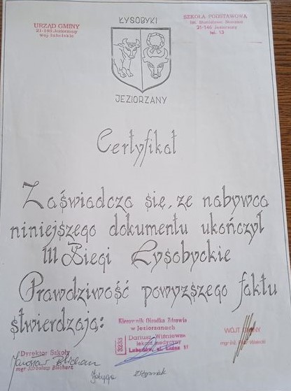 W latach 1994 – 2008 r. w czerwcu organizowane były w Jeziorzanach Biegi Łysobyckie. Pomysłodawcą tej imprezy sportowej był ówczesny dyrektor Szkoły Podstawowej w Jeziorzanach p. Jarosław Blicharz. Początkowo organizatorom przyświecało kilka celów: zbiórka na ultrasonograf dla miejscowego Ośrodka Zdrowia, propagowanie zdrowego stylu życia, promocja miejscowej szkoły oraz Jeziorzan. Udział w biegach brali uczniowie szkół z okolicznych gmin oraz dorośli. Impreza angażowała miejscowe władze, rodziców, strażaków, uczniów i mieszkańców. To było sportowe święto Jeziorzan. Trasa biegów przebiegała ul. Kościelną, Jeziorną, Rynek. Biegi odbywały się w kilku kategoriach. W 1998r. program imprezy został poszerzony o wyścig „Rydwanów”. Poniżej zamieszczam fotografię certyfikatu, który otrzymywał każdy uczestnik, zaproszenie oraz folder wydany w 1998r.