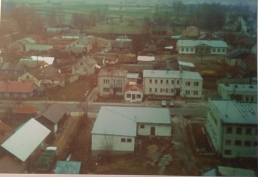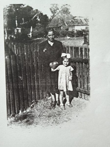 Zdjęcie przedstawia p. Helenę Wójcicką z córką Teresą, w tle widok na róg ulicy Warszawskiej i Babiej – widoczny jest krzyż, który stoi do dzisiaj (obecnie przy domu p. Kulików). Fotografię wykonano ok 1953r. Od lewej stoją: Wacław Tarczyński, Stanisław …