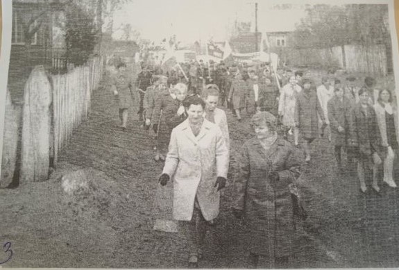 Przytoczno (obok posesji Lemieszków i Siepkowskich). Pochód zmierza do Jeziorzan. Budynków po lewo już nie ma. W tym miejscu stoi pawilon handlowy. Pierwszy budynek po lewo to piekarnia. Drugi to dom Ponikowskiego (był piekarzem). Potem kupił posesję w Przytocznie wraz …