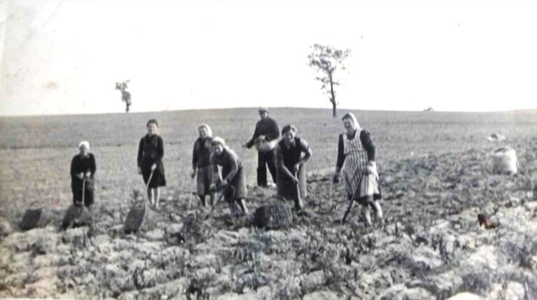Zdjęcie wykonano najprawdopodobniej w czasie okupacji. Kobiety kopią ziemniaki na polu zwanym Księża Góra położonym obok Stawika, a na zachód od wsi Drewnik. Druga kobieta od lewej to p. Genowefa Kuzia, po mężu Filipowicz, dalej jej siostra Kazimiera, zaś mężczyzna …