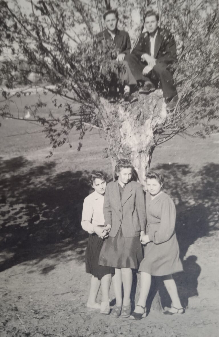 Od prawej patrząc na zdjęcie: w kąpielówkach Stanisław Krzyżanowski, widoczna głowa to Zdzisław Lemieszek, w białej koszuli Kazimierz Szabelski z ul. Młyńskiej, z papierosem Waldemar Gremplewski, obok niego Edward Kijek i pierwsza z lewej obok Kijka Maria Kępa, w środku …