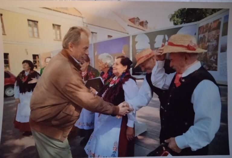 Prezydent Zamościa Marcin Zamoyski składa gratulacje kapeli ludowej i zespołowi śpiewaczemu „Kumy” z Przytoczna. Od prawej: Stefan Ciołek z Przytoczna, śp. Eugeniusz Wojciechowski z Jeziorzan i panie z zespołu: Kazimiera Siedlec, osoba mi nieznana, śp. Anna Ciołek (w okularach), Krystyna …