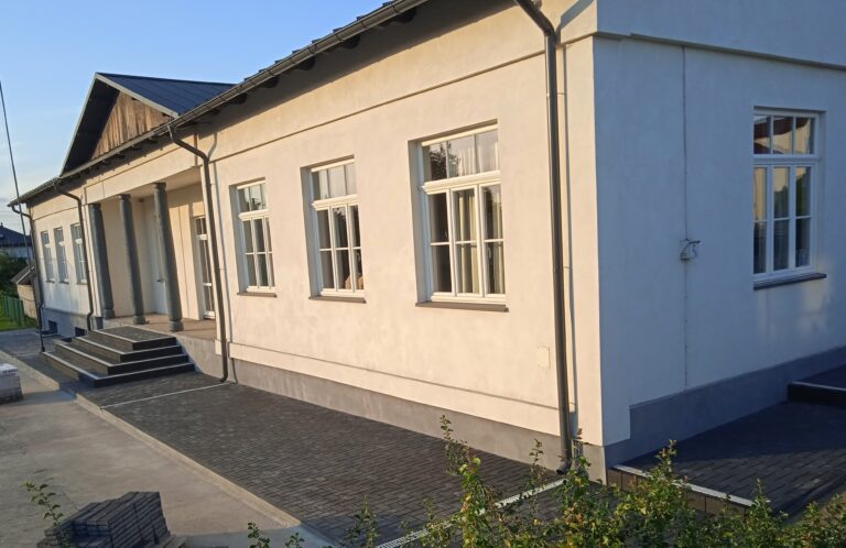Budynek Biblioteki – Centrum Spotkań w Jeziorzanach w nowej odsłonie. Wybudowano schody zewnętrzne oraz wyłożono kostką brukową nierówności przy budynku. Jest estetycznie i bezpiecznie.
