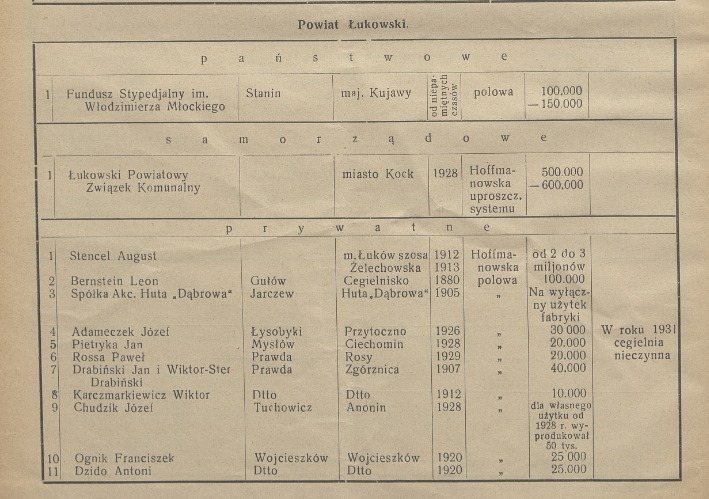 Pierwsze zdjęcie ukazuje cegielnię Kazimierza Kuszlla. Fotografia pochodzi ze zbiorów p. Stefana Ciołka. Druga fotografia ukazuje wykaz cegielni polowych i Hoffmanowskich na terenie województwa lubelskiego według stanu na 1 lipca 1931r. Zdjęcie pochodzi ze strony Historia Ziemi Łukowskiej. Łuków i okolice.
