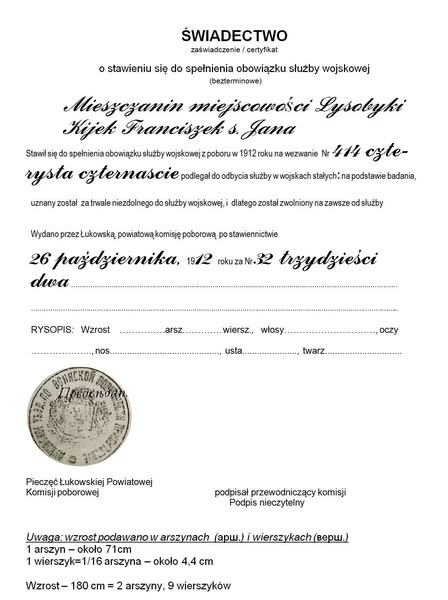 Dokument rosyjski z 1912r i jego tłumaczenie na polski przez p. Marka Sosnowskiego.