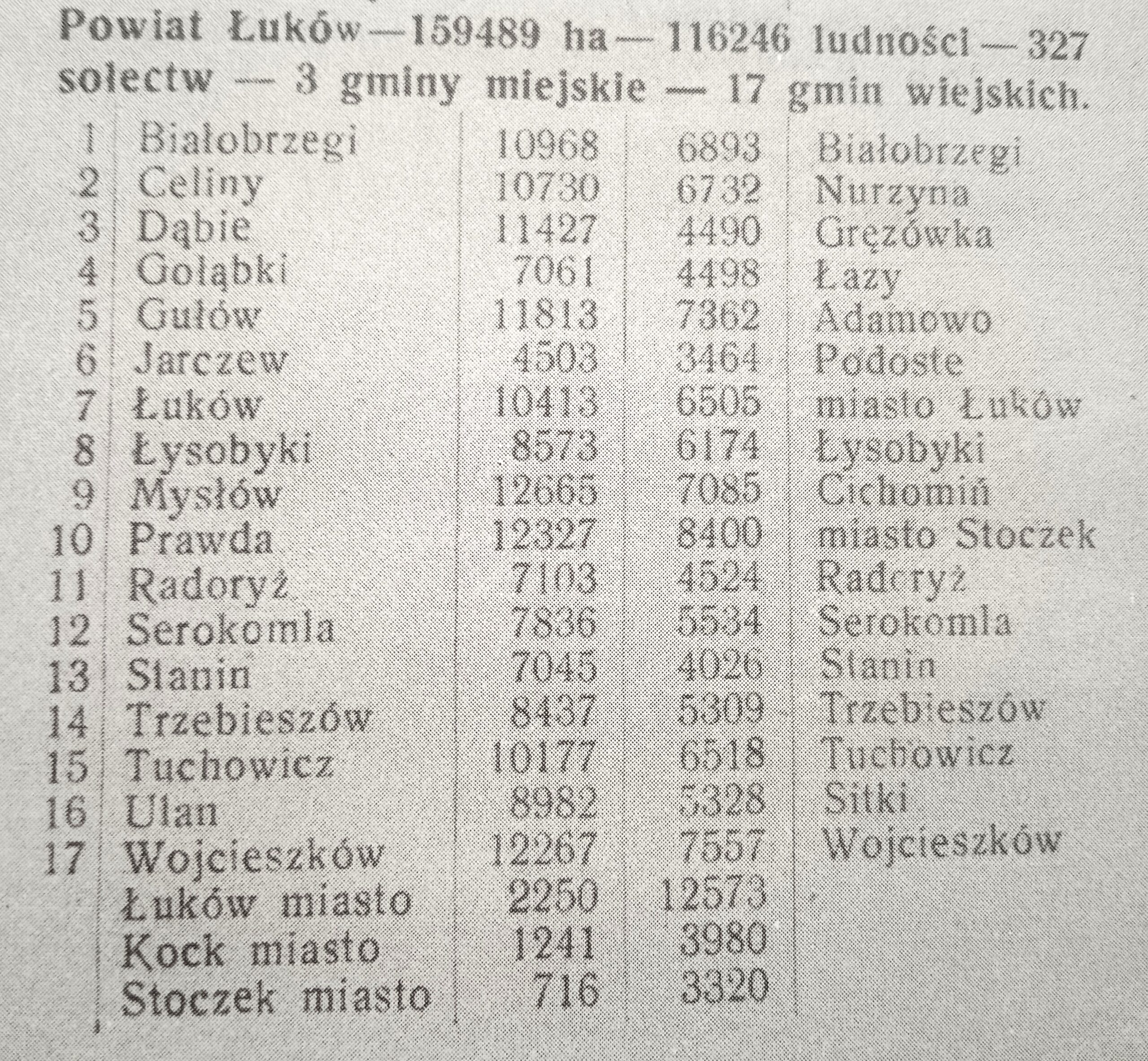 Na zdjęciu pierwsza kolumna to nazwa gminy, druga to powierzchnia gminy w hektarach, trzecia to liczba mieszkańców, czwarta kolumna to siedziba gminy.