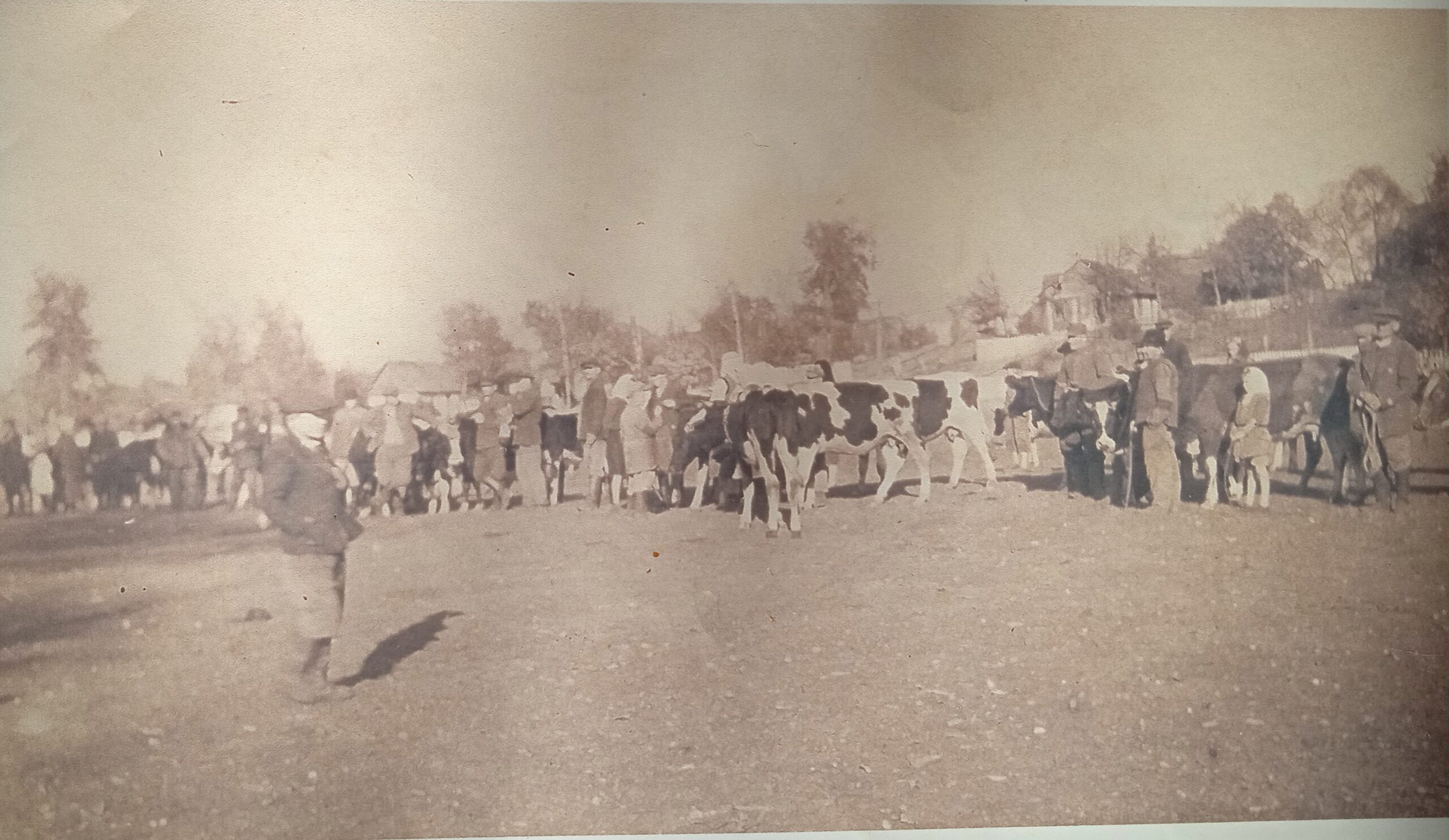Zdjęcie ukazuje mieszkańców Przytoczna, którzy odstawiali kontyngent, czyli obowiązkowe dostawy płodów rolnych i zwierząt na rzecz Niemców. Widoczny odbiór kontyngentu odbywał się na placu w centrum wsi (obecnie plac targowy i firma „Tamiza”).