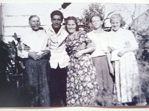 Od lewej: Henryk Krzyżanowski, p. Henryk Romańczuk, mąż p. Genowefy, p. Genowefa, Stanisław Furtak, Barbara Krzyżanowska – kuzynka p. Henryka Krzyżanowskiego. Zdjęcie wykonano po wojnie.