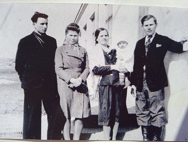 Przed szkołą w Przytocznie. Od lewej: Nieznany mężczyzna, Michalina siostra p. Genowefy, p. Krzyżanowska z dzieckiem oraz jej mąż p. Józef Krzyżanowski. Zdjęcie wykonano w czasie wojny.