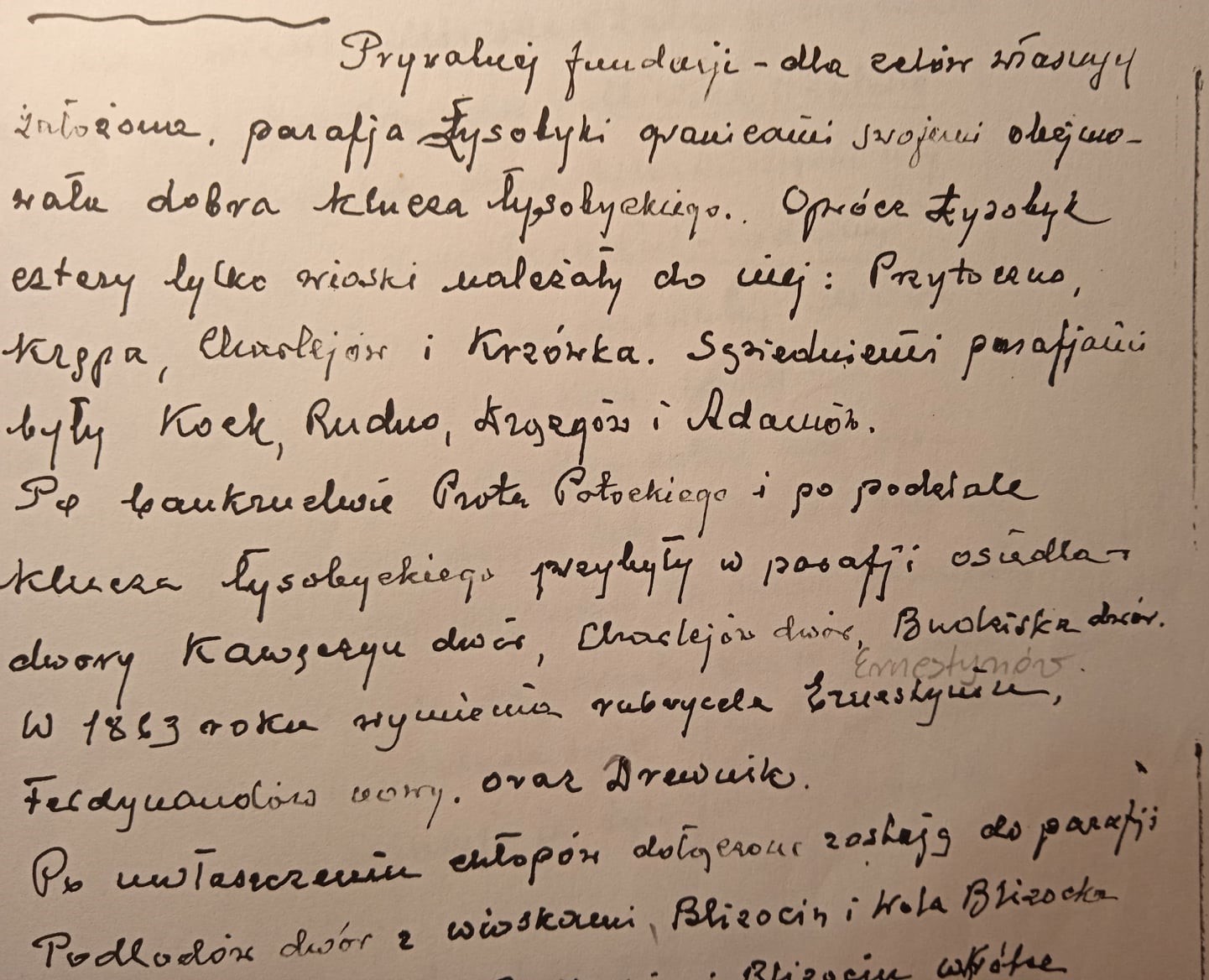 Od 1798r. dobra klucza łysobyckiego należały do Prota Potockiego, który zbankrutował, a jego majątek podzielono. W wyniku podziału powstały w parafii Łysobyki dwory w Kawęczynie, Charlejowie i Budziskach. Kilkadziesiąt lat później w 1863r. w dokumentacji kościelnej wymieniony jest Ernestynów, Ferdynandów i Drewnik. Po uwłaszczeniu chłopów w 1864r. do parafii dołączono dwór w Podlodowie z wioskami Blizocin i Wola Blizocka. W 1887r. Blizocin i Podlodów powracają do parafii Drążgów, gdyż w tym czasie hr. Kicki wybudował kościół w Sobieszynie.