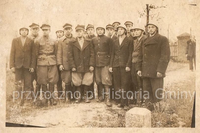 Zdjęcie z początku lat 40-tych. Widoczny w tle fragment ogrodzenia to słup od bramy i fragment furtki. We wrześniu 1939 (10.09.?) w południowy fragment parkanu trafiła niemiecka bomba. Na zdjęciu od lewej strażacy z Przytoczna: drugi Wacław Mazurek, szósty Władysław Tarnowski, za nim jego brat Stefan Tarnowski.