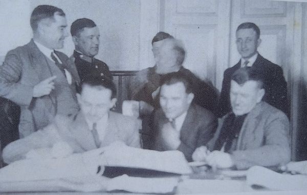 Zdjęcie ukazujące mieszkańców gminy Łysobyki zostało wykonane we wrześniu 1937r. Siedzą od lewej: Tadeusz Nieśpiałowski, kasjer, wójt gminy. Stoją od prawej: pisarczyk, Ludwik Protasiewicz, komendant posterunku policji Józef Szałas i kierownik szkoły w Łysobykach – Albin Rosolski. Fotografia pochodzi z książki T. Nieśpiałowskiego „ Czas grozy i oporu”.