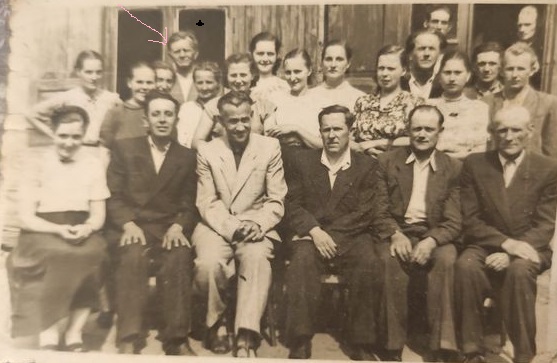 Łysobyki, lata 50-te. Pracownicy Gminnej Spółdzielni. Pierwszy rząd od prawej siedzą; Gremplewski z Łysobyk, Mierzwiński Bolesław z Przytoczna, Andrzejewski – nauczyciel, osoba nierozpoznana, Alikowski z łysobyk, kobieta nierozpoznana. Z tyłu od lewej stoją: druga Mazurkowa z Łysobyk, strzałka wskazuje Franciszka Oborskiego, od sierpnia lub września 1944 do stycznia 1945r. był wójtem, siódma Lemieszkowa z Łysobyk, dziesiąta Brygołowa z Łysobyk.