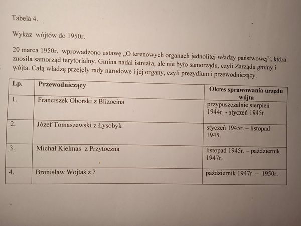 W styczniu 1945r. wybrano nowego wójta, został nim Józef Tomaszewski, pełnił obowiązki do jesieni 1945r. Podwójcim (zastępca wójta) został Bolesław Mierzwiński z Przytoczna. W skład Zarządu weszli jeszcze, jako członkowie: Stanisław Szabelski z Łysobyk, Franciszek Oborski z Blizocina (były wójt) i Jan Woźniak z Niedźwiedzia.