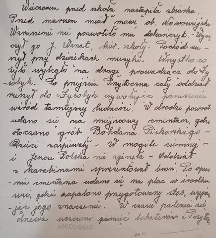 „Dnia 10 listopada urządzono na wniosek p. Beczka capstrzyk, w którym wzięły udział dzieci szkolne z lampionami, Strzelcy i członkowie tutejszej Straży Pożarnej [w Przytocznie]. Na czele pochodu kroczyła orkiestra (grali bezinteresownie), potem dzieci z 4 olbrzymimi lampionami, strażacy razem ze strzelcami, dzieci szkolne. Porządek utrzymali nauczyciele. Wieczorem przed szkołą nastąpiła zbiórka. Przed marszem miał mowę ob. Nowowiejski. Wzruszenie nie pozwoliło mu dokończyć . Wyręczył go J. Wanat, kierownik szkoły. Pochód ruszył przy dźwiękach muzyki. Wszystko co żyło, wyległo na drogę prowadzącą do Łysobyk. Po przejściu Przytoczna cały oddział ruszył do Łysobyk, wywołując poruszenie wśród tamtejszej ludności. W drodze powrotnej udano się na miejscowy cmentarz, gdzie otoczono grób Bogdana Piskorskiego – dzieci zaśpiewały – „W mogile ciemnej” i „Jeszcze Polska nie zginęła” . Oddział z karabinami prezentował broń. Po opuszczeniu cmentarza udano się na plac w środku wsi, gdzie zapalono przygotowany stos, wyjaśniając jego znaczenie. W czasie palenia wici z drzewa uczczono pamięć bohaterów z Przytoczna, którzy polegli za ojczyznę w czasie wojny polsko-bolszewickiej. Po wygaśnięciu ognia, pochód został rozwiązany. Starzy jeszcze długo gwarzyli, wspominając swoje przeżycia. Dnia 11 listopada Strzelcy wzięli udział w nabożeństwie w miejscowym kościele [w Łysobykach]”