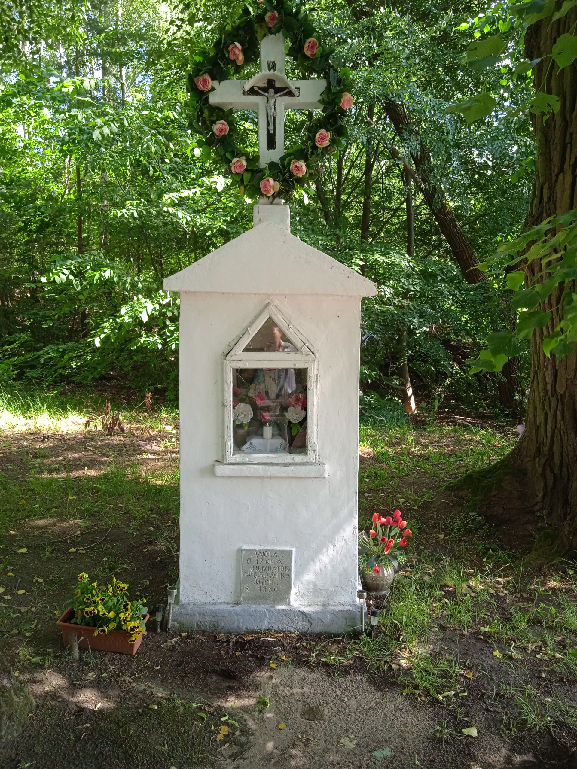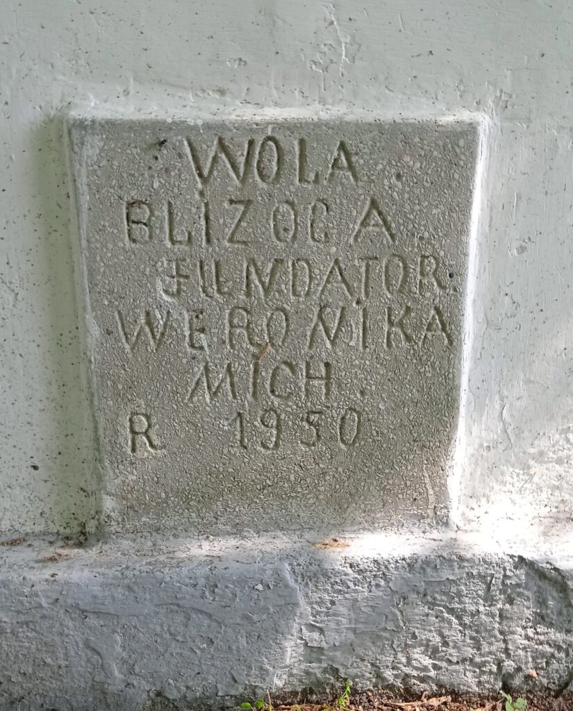 Kapliczka przy wjeździe do Woli Blizockiej. Na drugim zdjęciu informacja o fundatorce.