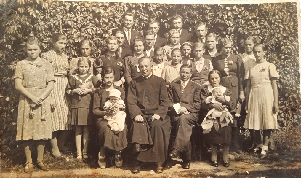 Na zdjęciu ks. Jan Kazimierczak, organista Grotnik (siedzi obok księdza) i chórzyści. Fotografie wykonano latem 1940r.