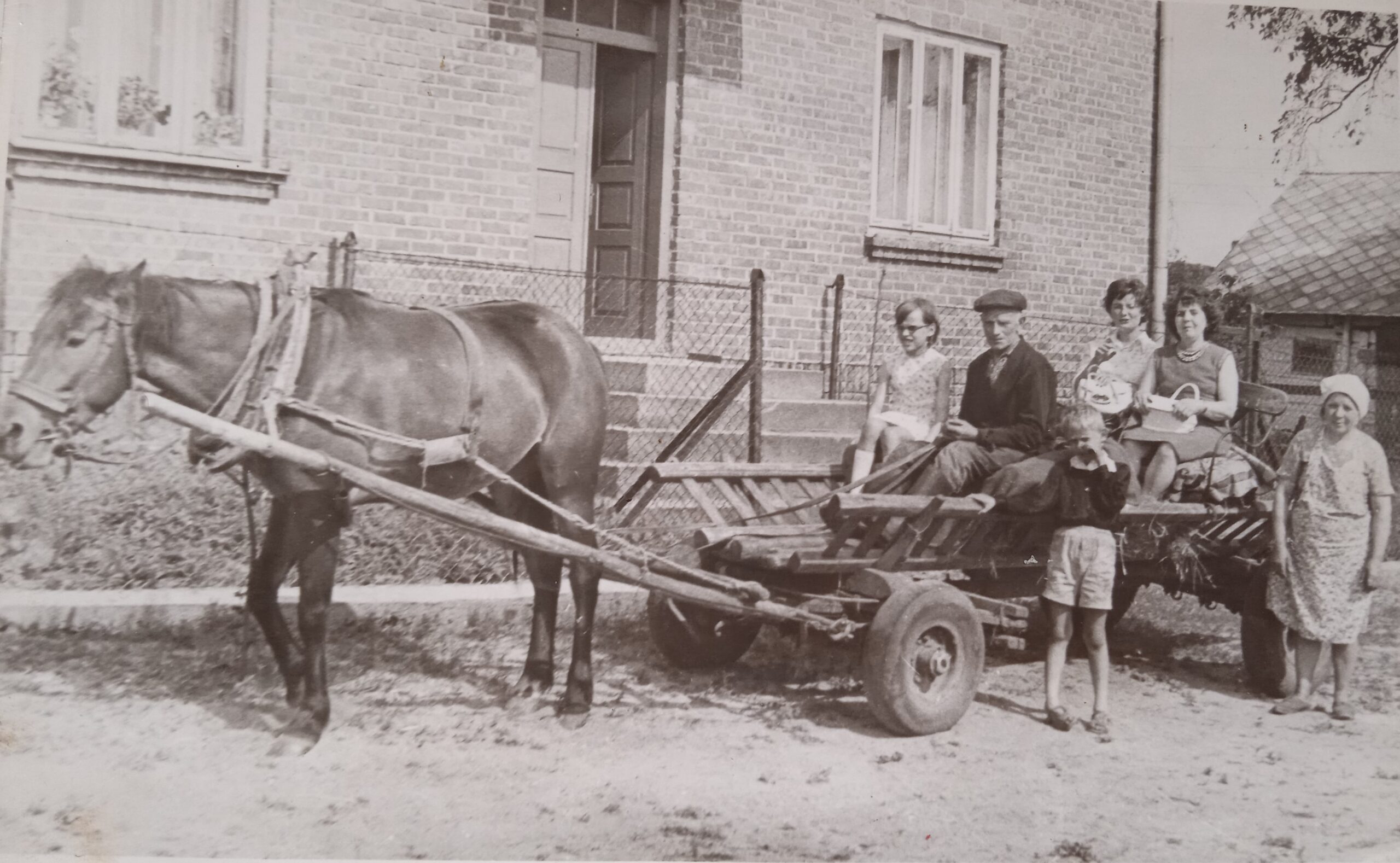 Na zdjęciu widoczni są moi dziadkowie ze strony mamy – Stanisław i Helena (stoi obok wozu) Rafalscy przed ich domem (dzisiaj ja w nim mieszkam). Na wozie z tyłu od prawej siedzi siostra mojej babci Marianna, a obok jej synowa. Obok dziadka siedzę ja, zaś przy wozie stoi mój młodszy brat. Zdjęcie wykonano 18 czerwca 1972r. Na fotografii ujęto moment przed wyjazdem do Przytoczna, do warszawiaka. Warszawiak to autobus, który kursował z Lubartowa do Warszawy, w Przytocznie był między godz. 15.00 a 16.00 każdego dnia. Był też warszawiak, który miał kurs z Kocka do Warszawy, w Przytocznie był ok. godz. 6.00. Warszawiaki kursowały też z Warszawy do Lubartowa i Kocka. Pierwszy z nich w Przytocznie był ok. godz. 11.00, drugi ok. godz. 19.00. Wszystkie te autobusy kursowały każdego dnia.