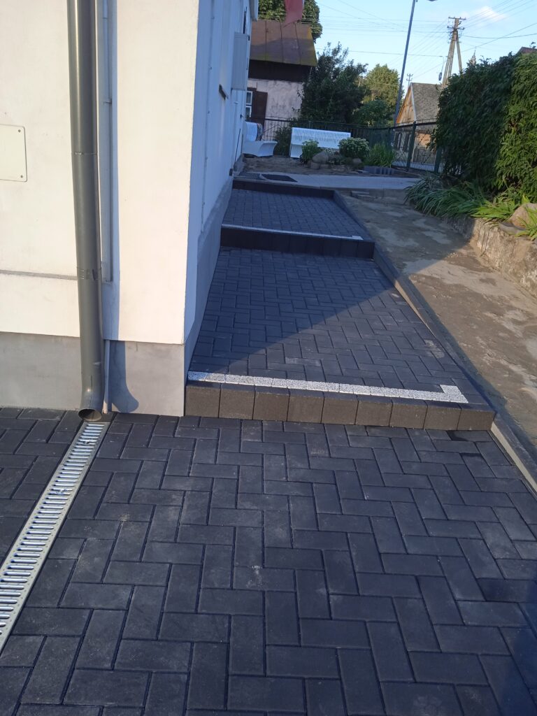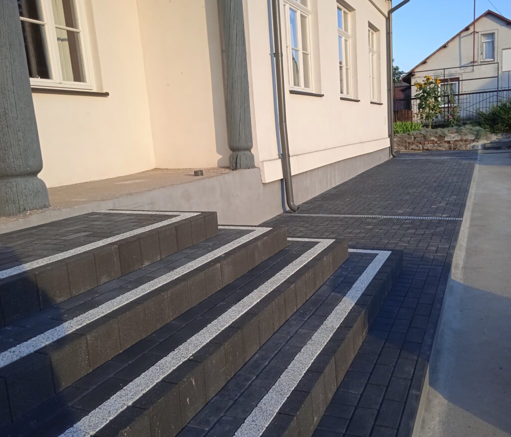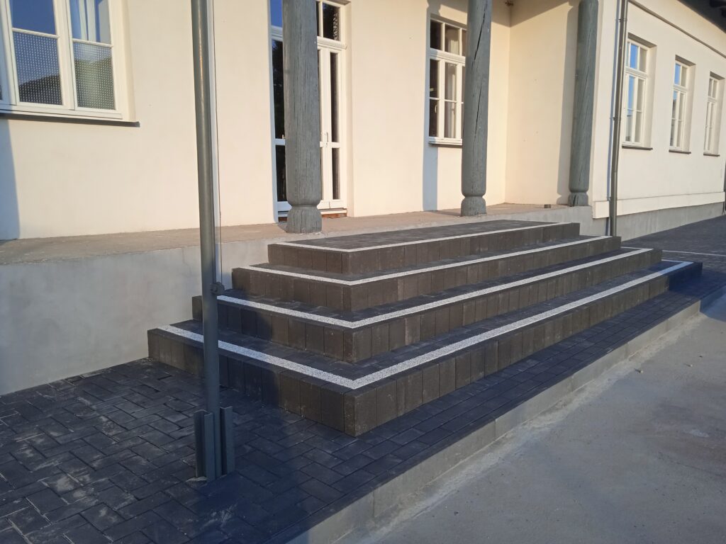 Budynek Biblioteki – Centrum Spotkań w Jeziorzanach w nowej odsłonie. Wybudowano schody zewnętrzne oraz wyłożono kostką brukową nierówności przy budynku. Jest estetycznie i bezpiecznie.