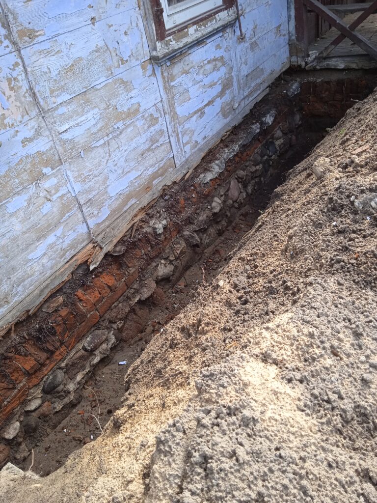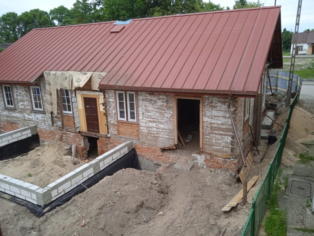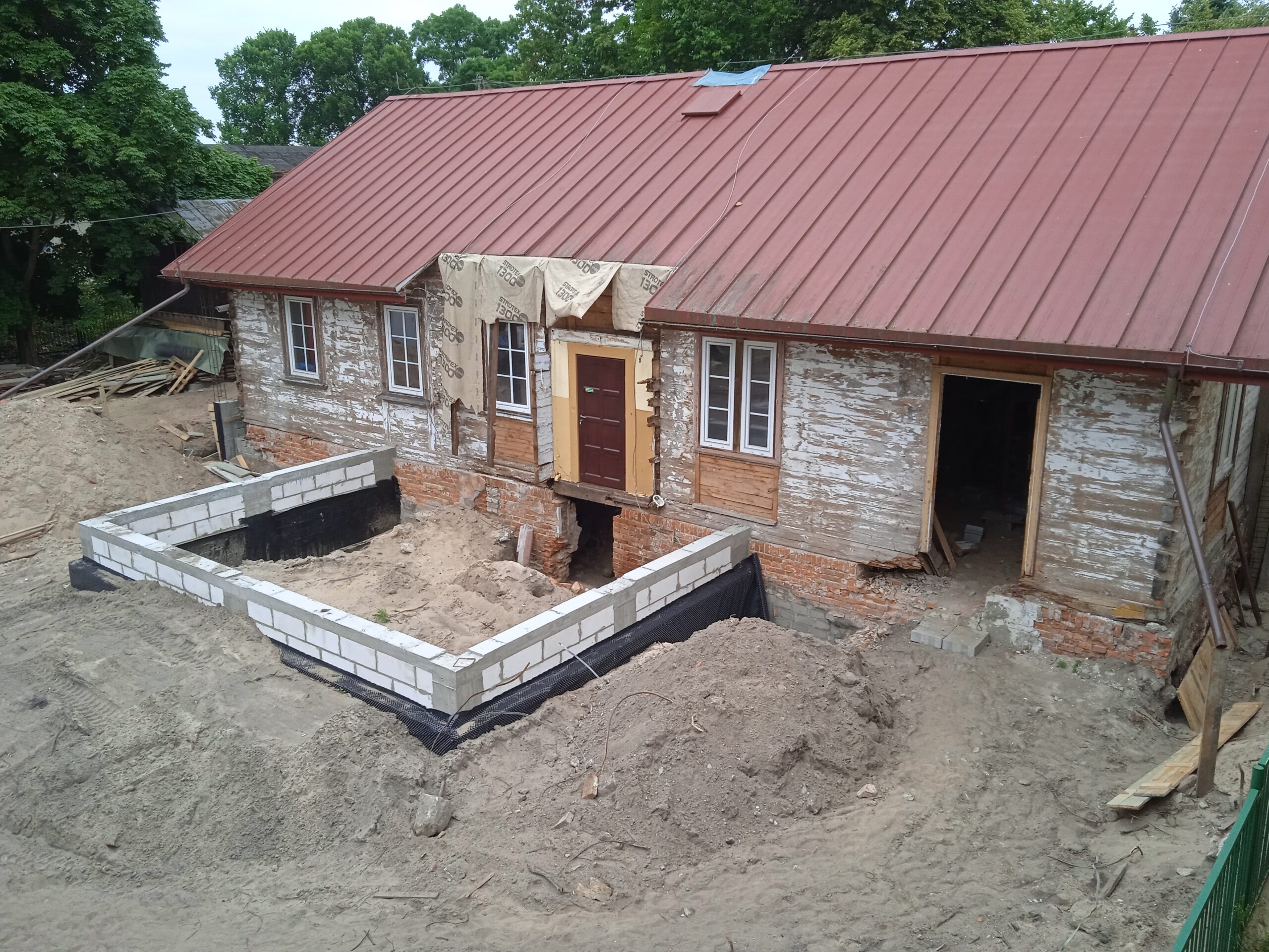 Remont budynku dawnego urzędu gminy (od lat 70-tych przedszkola i posterunku policji, wtedy milicji) i parku trwa. Moją uwagę zwróciły dawne fundamenty budynku, dość solidne mimo że budynek drewniany. Fundament tworzą warstwy kamieni spojonych zaprawą a następnie cegły. Podwaliny nie wytrzymały upływu czasu.