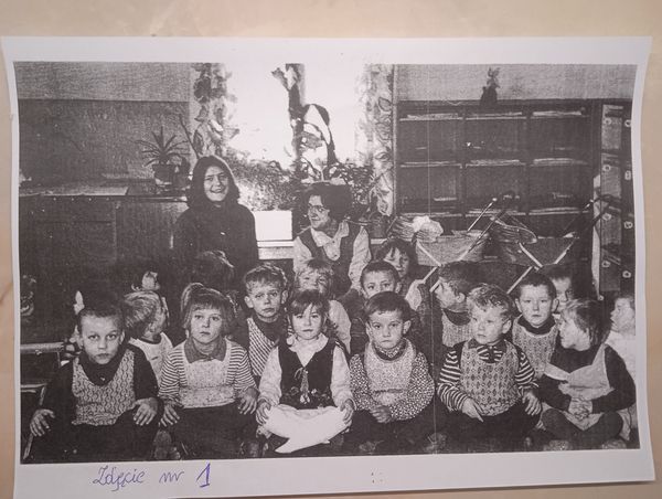 (Fotografię wykonano ok. 1968 – 69r. Zdjęcie ukazuje dzieci z rocznika 1964, 65 i 66r.) pierwsza od prawej p. Ewa Radomska – przedszkolanka, druga widoczna osoba to p. Teresa Szabelska – pomoc. Posiłki przygotowywała p. Irena Mitura