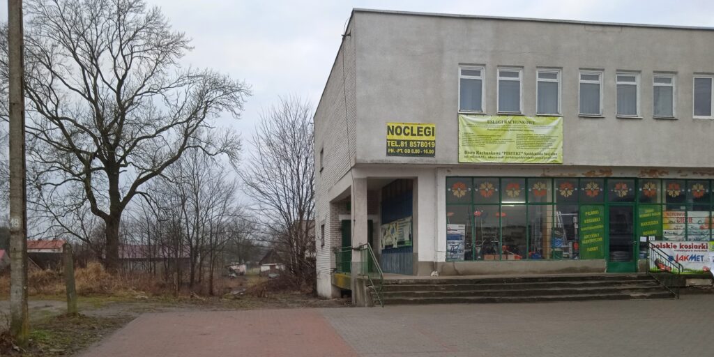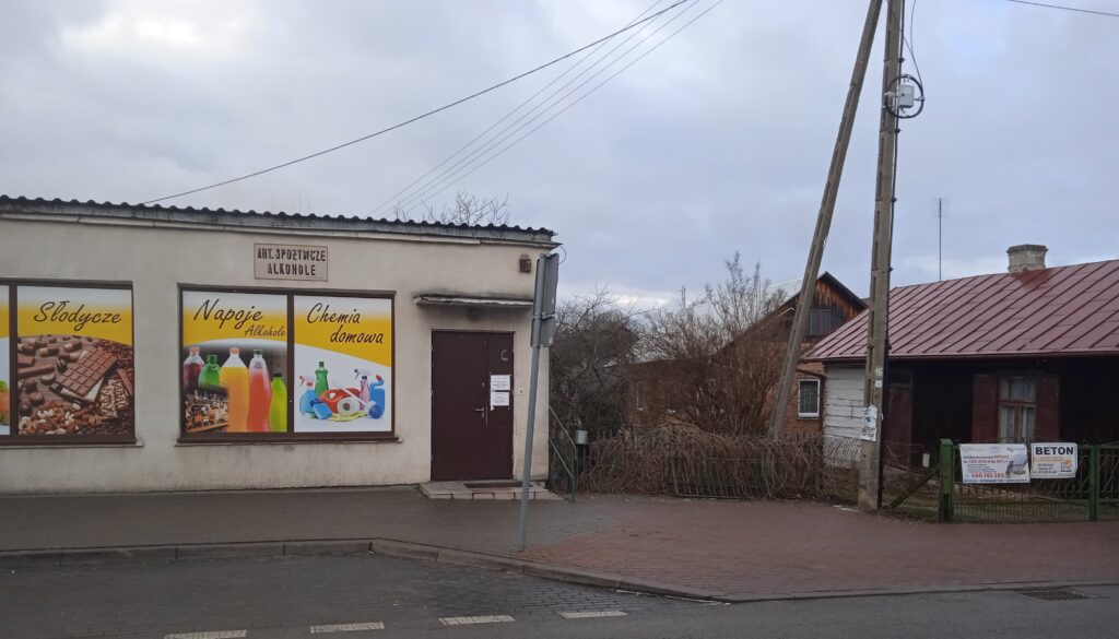 Na zdjęciu 2. Widoczny jest wybudowany w latach 50-tych sklep należący do GS. Przed wojną stały w tym m miejscu budynki zamieszkałe przez Żydów. Widoczna przestrzeń pomiędzy sklepem a posesją rodziny Kijek to fragment przedwojennej ulicy łączącej Rynek z obecną ul. Przejazd. Jak wspominały moje rozmówczynie była na tyle szeroka, iż swobodnie mógł przejechać wóz konny. Widoczne drzwi sklepu wskazują miejsce domu, w którym przed wojną mieszkał Żyd Mosze, ludzie nazywali go Mosiek. Był szewcem. Co go wyróżniało spośród innych szewców, a było ich w Łysobykach ok. 40. Był bardzo biedny.
