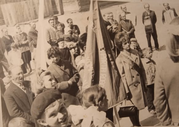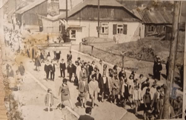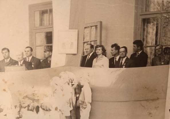 Przed szkołą w Łysobykach. Przemawia Lucjan Sikorski, za nim stoi dyr. PGR Witek. Drugi od prawej Dionizy Oborski, gminny agronom, kolejny w lewo (z przypiętym medalem) to Jan Szabelski z Kacapków z ul Jeziornej, Tadeusz Brukacz, kobieta nierozpoznana, Jerzy Guz prezes GS „SCH”