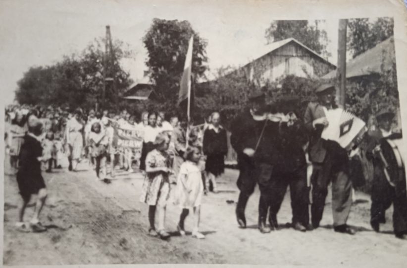 Pochód pierwszomajowy. Myślę iż to lata koniec 50-tych początek 60-tych. Na harmonii gra prawdopodobnie Lemieszek z Przytoczna, na skrzypcach chyba Brygoła z Woli Blizockiej. Może ktoś rozpozna miejscowość. .
