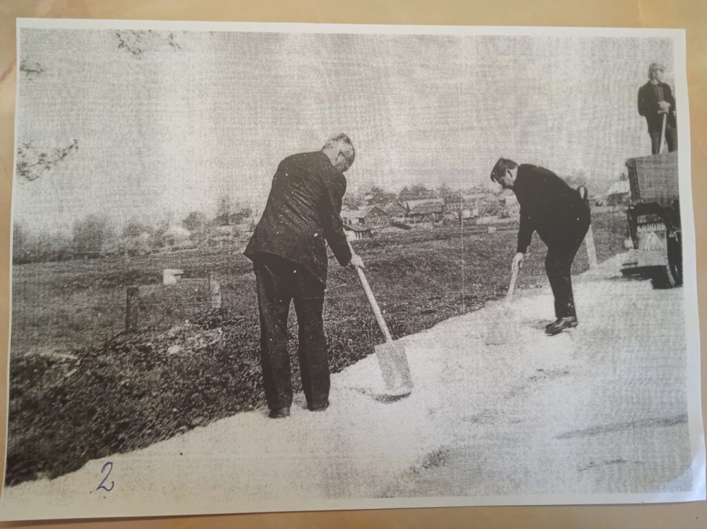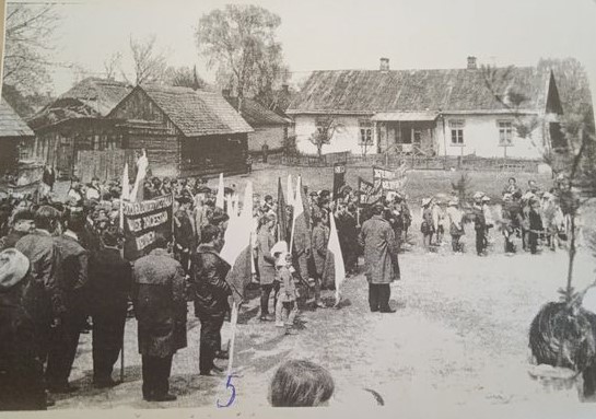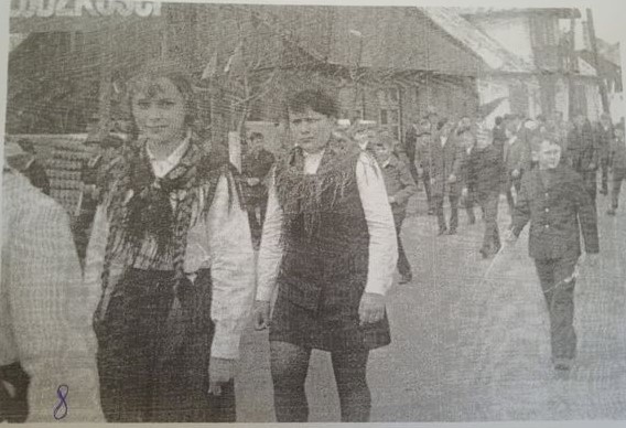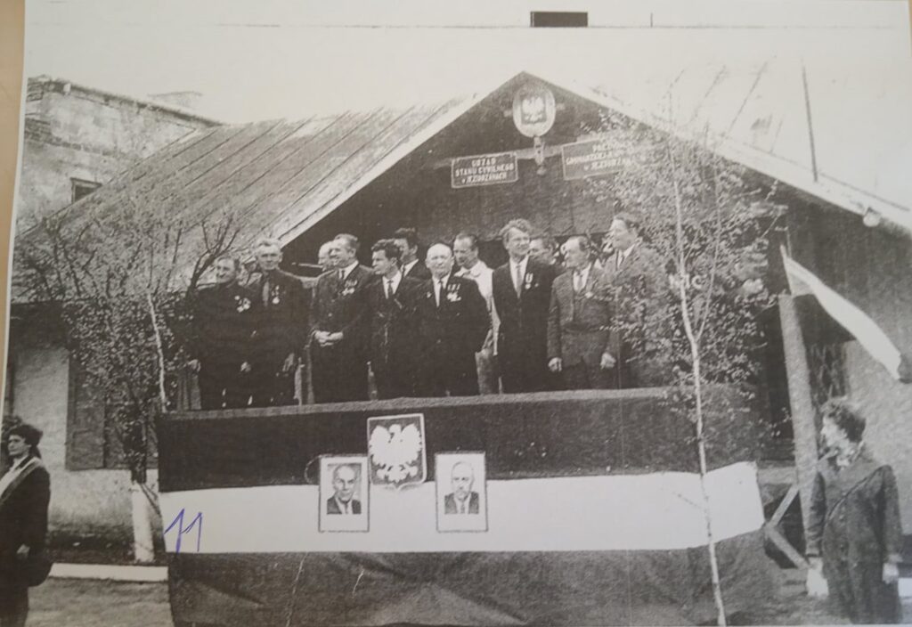 Trybuna honorowa przed dawnym urzędem gminy w Jeziorzanach. Na trybunie w pierwszym rzędzie drugi od prawej to Szabelski z Jeziornej, nazywano ich Kacapki, potem Tadeusz Brukacz, następnie Lucjan Sikorski, ci dwaj mężczyźni – nie znam ich. Potem stoi Szabelski z Ogrodowej – nazywano go Sargac i chyba Więsek. W drugim rzędzie w białym płaszczu Szafraniuk – dyrektor szkoły w Przytocznie.