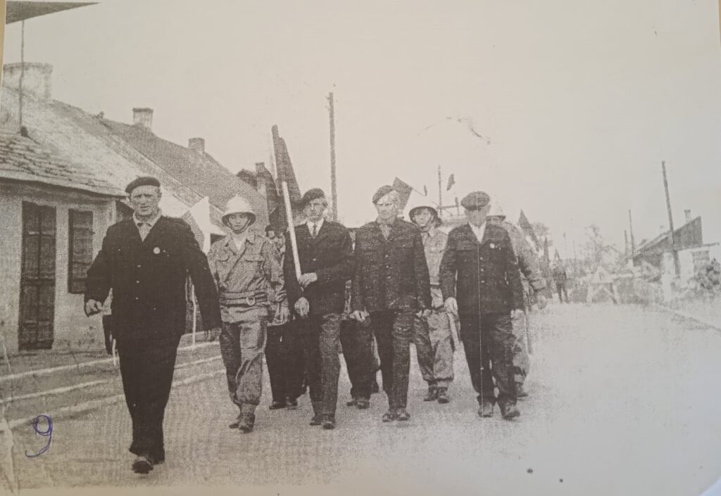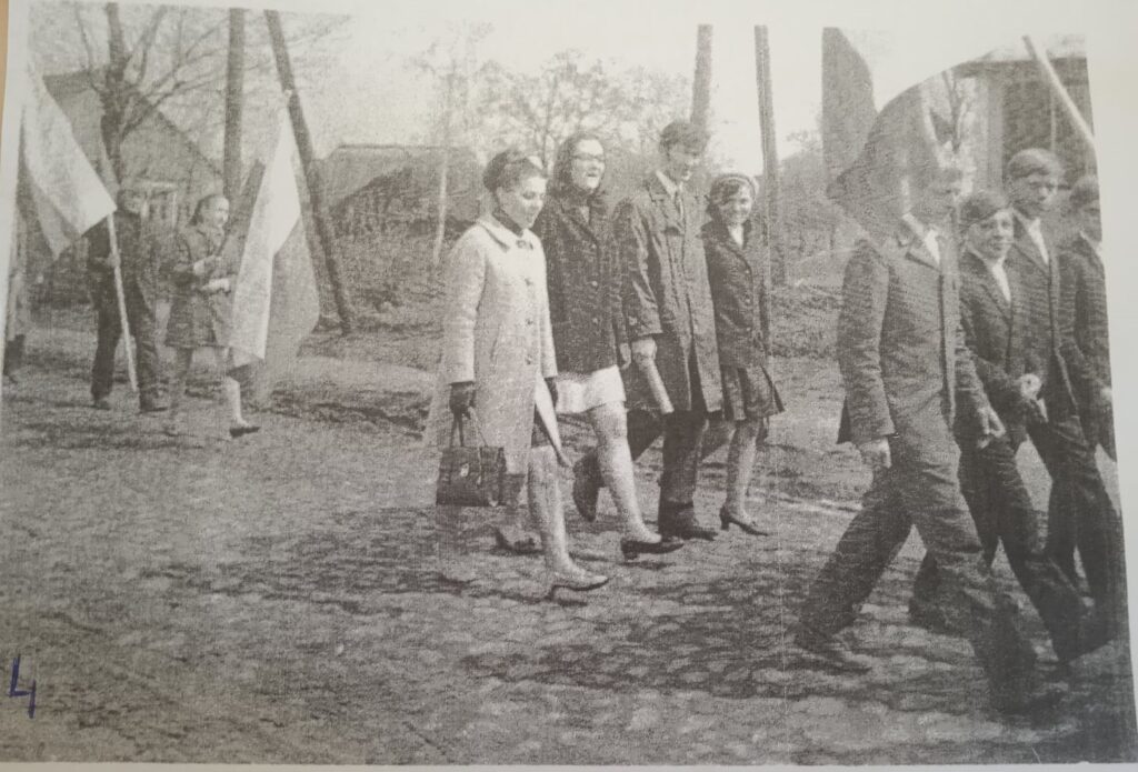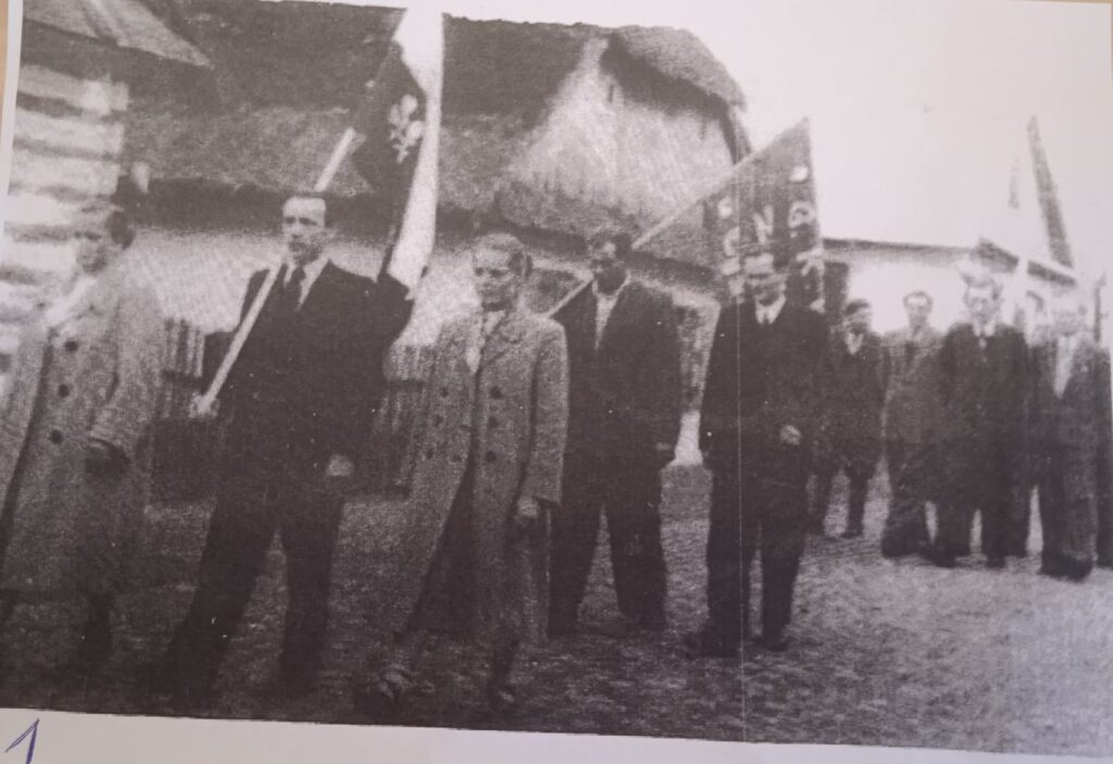 Pierwszy Stanisław Krygiel z ul. Kościelnej. Z tyłu od prawej: Rafalski z Woli Blizockiej, Gremplewski z Jeziorzan z ul. Warszawskiej, Ryszard Grzechnik z Jeziorzan (trzyma flagę)