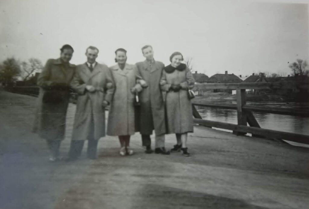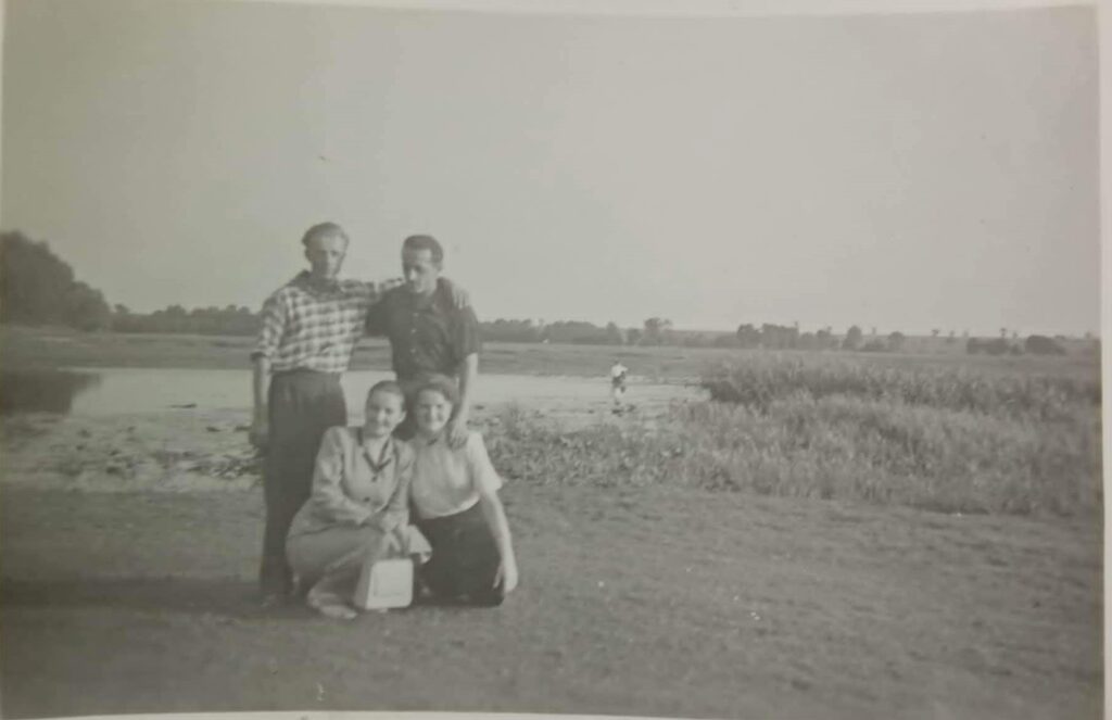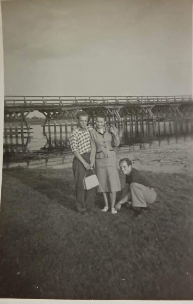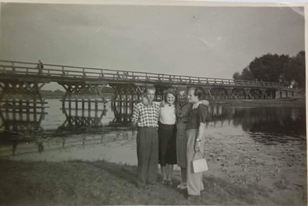 Od strony Wieprza Marian Furtak, Teresa Alina Wójcika, Kazia Szabelska i Józek Krzyżanowski. Widać piękny stary drewniany most.