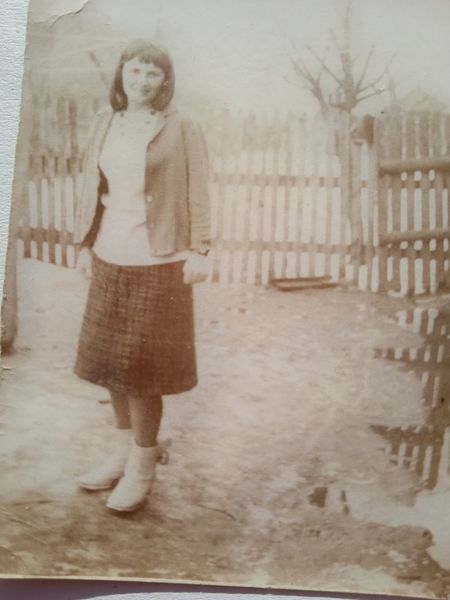 Janina Bartoszewicz na podwórku rodziny Krzyżanowskich na ul. Przejazd