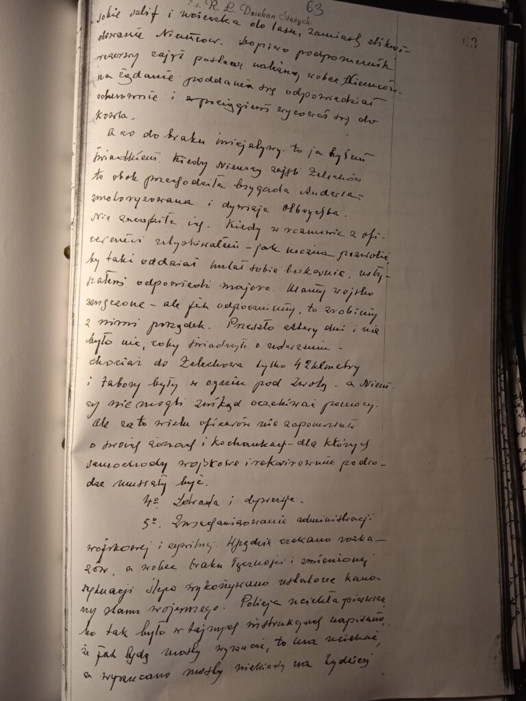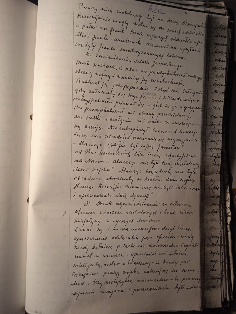 3 – brak odpowiedzialności za żołnierza oficerów zwłaszcza zawodowych i brak własnej inicjatywy u wyższych dowódców. Znane są i to na nieszczęście dosyć liczne opuszczanie oddziałów przez oficerów – wtedy kiedy żołnierz potrzebował kierownictwa i opieki – nawet w ucieczce. Opowiadał mi żołnierz inteligentny, malarz z Warszawy – że kiedy pod Brześciem pociąg wojska natknął się na samochód i trzy motocykle niemieckie – to pierwszym czynem majora i poruczników było zdarcie sobie szlif i ucieczka do lasu, zamiast zlikwidowanie Niemców. Dopiero podporucznik rezerwy zajął postawę należną wobec Niemców: na żądanie poddania się odpowiedział odmownie i z pociągiem wycofał się do Kowla.