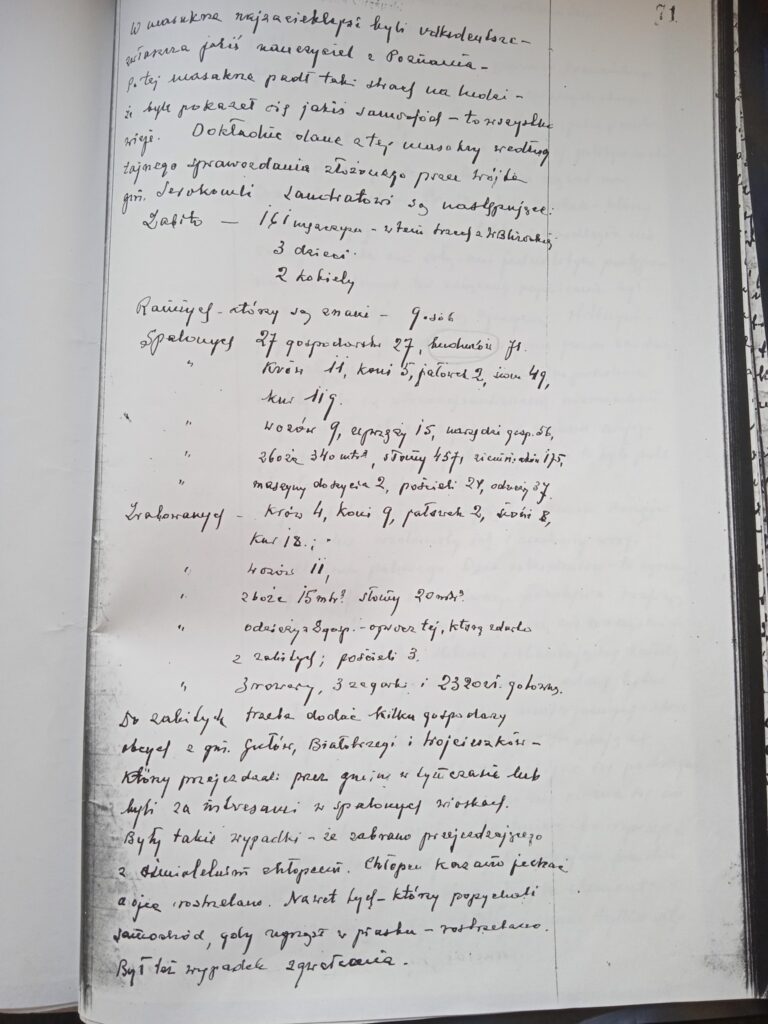 Spalonych – 27 gospodarstw, (…?) 71, krów 11, koni 5, jałówek 2, świń 49, kur 119, wozów 9, uprzęży 15, narzędzi gospodarskich 56, zboża 340 m³, słomy 457, ziemniaków 175, maszyny do szycia 2, pościeli 27, odzieży 37