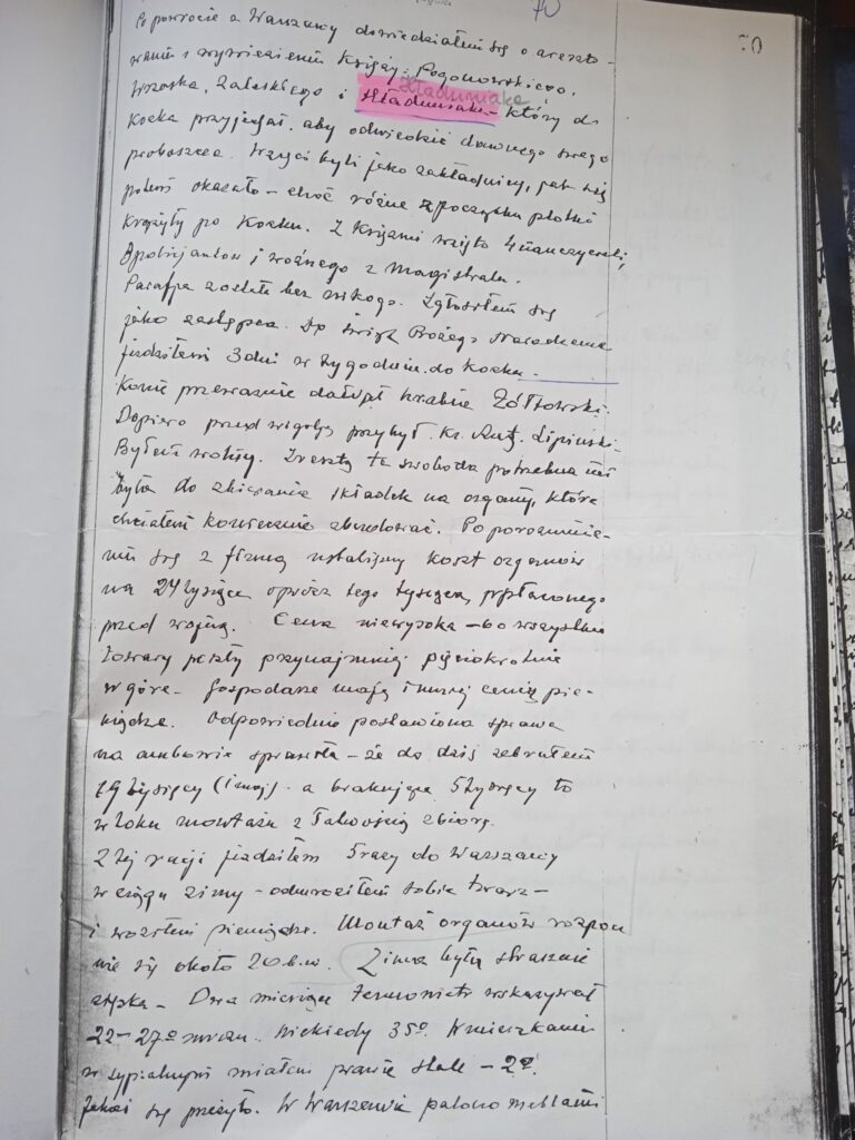 Parafia została bez nikogo. Zgłosiłem się jako zastępca. Do świąt Bożego Narodzenia jeździłem 3 dni w tygodniu do Kocka. Konie przeważnie dawał hrabia Żółtowski. Dopiero przed Wigilią przybył ks. August Lipiński. Byłem wolny. Zresztą ta swoboda potrzebna mi była do zbierania składek na organy, które chciałem koniecznie zbudować. Po porozumieniu się z firmą ustaliliśmy koszt organów na 24 tysiące oprócz tego tysiąca wpłaconego przed wojną. Cena niewysoka, bo wszystkie towary poszły przynajmniej pięciokrotnie w górę. Gospodarze mają i mniej cenią pieniądze. Odpowiednio postawiona sprawa na ambonie sprawiła – że dziś zebrałem 19 tysięcy (i maj), a brakujące 5 tysięcy to w toku montażu z łatwością zbiorę. Z tej racji jeździłem 5 razy do Warszawy w ciągu zimy – odmroziłem sobie twarz – i woziłem pieniądze. Montaż organów rozpocznie się około 20 bm.