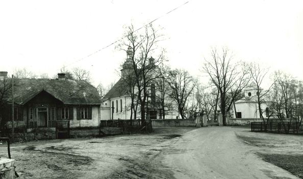 Budynek starej plebanii, już nie istnieje. Zdjęcie Witolda Rusina wykonane w 1986r. To w tym budynku mieszkał ks. Kazimierczak i tu uciekinierzy znajdowali na chwilę przyjazną przystań. Tu też ksiądz przyjmował oficerów..