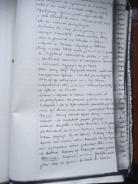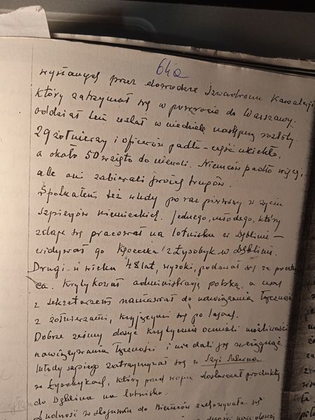 Spotkałem też wtedy po raz pierwszy w życiu szpiegów niemieckich. Jednego, młodego, który zdaje się pracował na lotnisku w Dęblinie – widywał go Kępeczka z Łysobyk w Dęblinie. Drugi w wieku 48 lat, wysoki, podawał się za pocztowca. Krytykował administrację polską a nas z sekretarzem [mowa o sekretarzu gminy Protasiewiczu] namawiał do nawiązania łączności z żołnierzami kryjącymi się po lasach. Dobrze żeśmy dosyć krytycznie ocenili możliwość nawiązania łączności i nie dali się wciągnąć. Młody szpieg zatrzymał się u Szyi Szlama w Łysobykach, który przed wojną dostarczał produkty do Dęblina na lotnisko.