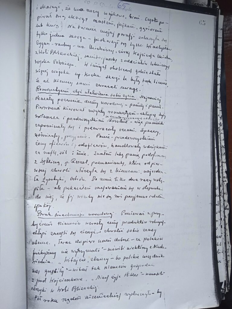 Romantyzm, chęć ułatwienia sobie życia– Najmniej okazały poczucia dumy narodowej- panny i panie. Pierwsze kierował zwykły romantyzm – chłopy były zwłaszcza i przede wszystkim ze zmotoryzowanych oddziałów dorodne – więc panienki zapominały się i przewracały oczami. Spacery, uśmiechy, przyjaźnie. Panie przede wszystkim żony oficerów i podoficerów handlowały wdziękami za naftę, sól i inne. Znałem taką panią podoficerową z Dęblina, p. Reszel, poznaniankę, która od pierwszej chwili włóczyła się z Niemcami, najeżdżała Łysobyki, Ostrów. Do mnie tylko dwa razy wstąpiła – ale pokazałem zachowaniem się w stosunku do niej, że jej wizyty nie są mi przyjemne i dała spokój.