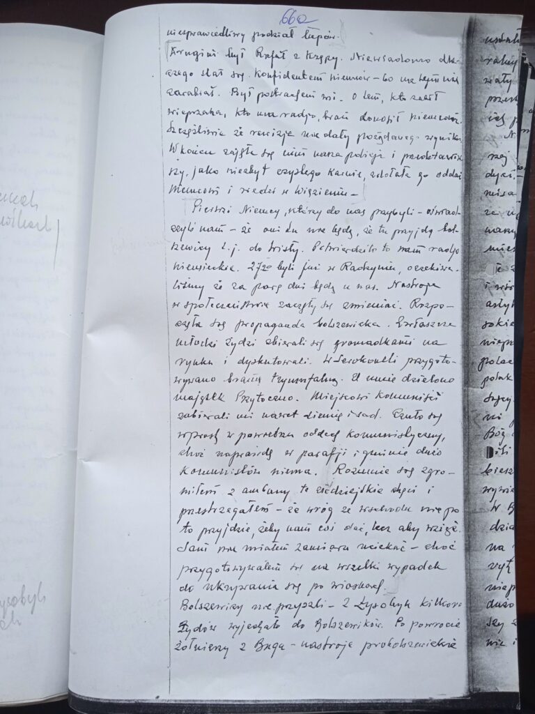 Bolszewicy nie przyszli – z Łysobyk kilkoro Żydów wyjechało do bolszewików [Jeden z nich wrócił wraz z Armią Czerwoną, został zabity przez kilku mieszkańców Łysobyk]. Po powrocie żołnierzy z Buga – nastroje probolszewickie ustały. Nędzne ubranie, niski poziom kulturalny żołnierza, rządy Żydów zdyskredytowały oby na zawsze bolszewizm. Chyba tylko przestępcze elementy i Żydzi biedniejsi pragną ich powrotu.