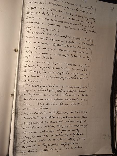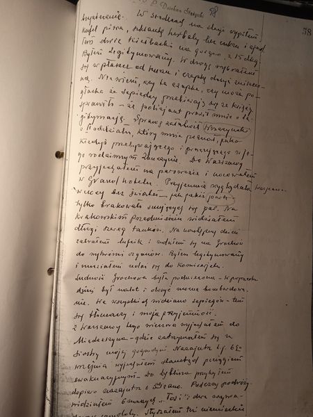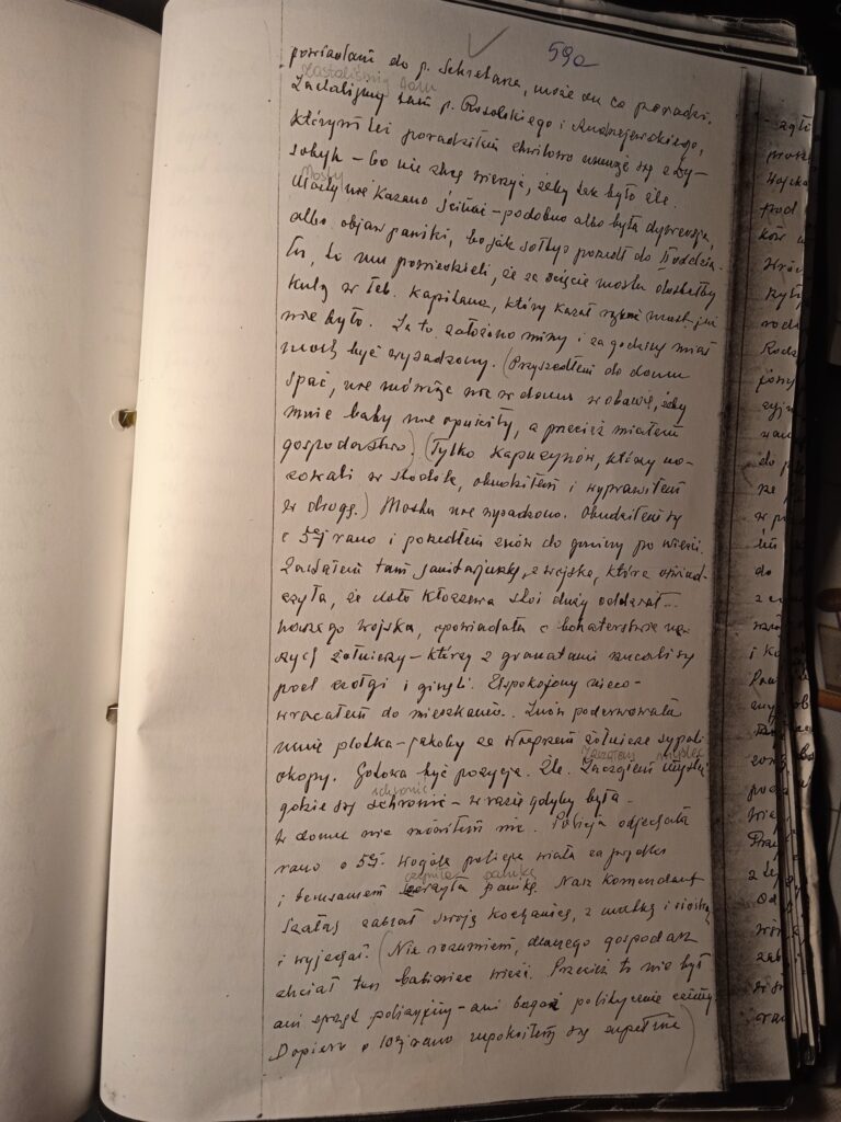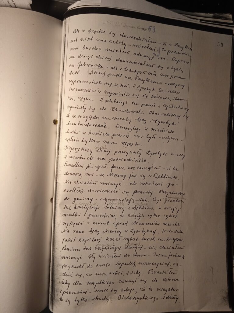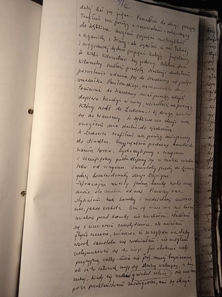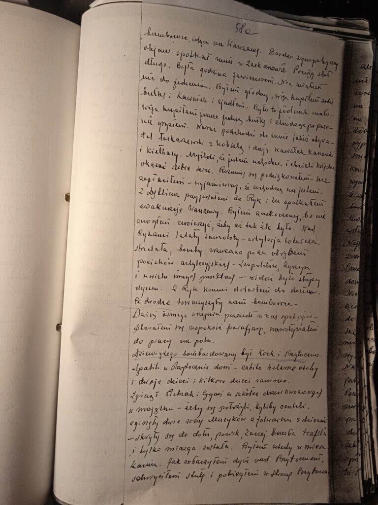 W poniedziałek wybrałem się do Warszawy. Chciałem dowiedzieć się , jak sprawa stoi z organami – chciałem zabrać lufcik od witraża w kościele, który był w reperacji. Chciałem zobaczyć, ile jest prawdy w tem, co mówili uciekinierzy o Dęblinie. Wsiadłem rano w autobus, który jeszcze chodził w Przytocznie i pojechałem. Dojechałem tylko do Ryk – bo autobus dalej bał się jechać. Poszedłem do stacji piechotą. Trafiłem na pociąg z rezerwistami odchodzący do Dęblina. Mogłem pojechać motocyklem z organistą z Ireny – ale sądziłem, że mi łatwiej i wygodniej będzie pojechać koleją. Jechaliśmy te kilka kilometrów trzy godziny. Ostatnie dwa kilometry szedłem piechotą. Na stacji dostałem pozwolenie udania się do Warszawy od podporucznika Pawłowskiego, komendanta stacji. Ponieważ do Warszawy miał pociąg odjechać dopiero kiedyś w nocy, wsiadłem na pociąg, który szedł do Łukowa i tą drogą udałem się do Warszawy. W Dęblinie na stacji nie mogłem nic dostać do jedzenia. W Łukowie trafiłem na pociąg miejscowy do Siedlec. Przyjechałem podczas bombardowania torów. Wyskoczyliśmy z wagonu i czem prędzej pokładliśmy się w rowku niedaleko od wagonu. Samoloty poszły do Łukowa, gdzie bombardowały stację Łapiguz. Wracając, rzuciły jedną bombę koło nas, może sto metrów od nas. Pierwszy raz słyszałem huk bomby i widziałem zniszczenia, jakie zrobiła. Bać się właściwie nie bałem, uciekać przed bombą nie uciekałem, kładłem się z uczuciem zawstydzenia, ale miałem głupie uczucie, zwłaszcza, że ze względu na słaby wzrok samolotu nie widziałem i nie mogłem ustosunkować się do niego. Już stokroć wolę pozycyjną walkę – może nie jest mniej bezpieczna, ale za to człowiek uczy się strony walczącej, a tu czekaj, kiedy cię walki (…?) i nie możesz poza przekleństwem zareagować ani się skryć bezpiecznie. W Siedlcach na stacji wypiłem kufel piwa, szklankę herbaty bez cukru i zjadłem dwie kiełbaski na gorąco z 15 dkg. Byłem legitymowany. W drogę wybrałem się w płaszczu od kurzu i czapkę dosyć zniszczoną. Nie wiem czy to czapka, czy może pogłoska że szpiedzy przebierają się za księży sprawiło – że policjant prosił mnie o legitymację. Sprawę załatwił (…?) z II oddziału, który mnie poznał, jako kiedyś przebywającego i pracującego w jego rodzinnym Zbuczynie. Do Warszawy przyjechałem na parowozie i nocowałem w Grand Hotelu. Przyjemnie wyglądała Warszawa w nocy bez świateł – jak jakiś port – tylko brakowało snujących się par. Na Krakowskim Przedmieściu widziałem długi szereg tanków. Na następny dzień zabrałem lufcik i udałem się na Grochów do wytwórni organów. Byłem legitymowany i musiałem udać się do komisariatu. Ludność Grochowa była podniecona – w poprzedni dzień był nalot i dosyć mocne bombardowanie. We wszystkich widziano szpiegów – tem się tłumaczy i moja przyjemność. Z Warszawy tego wieczora wyjechałem do Miedzeszyna – gdzie zatrzymałem się u siostry mojej gospodyni. Nazajutrz tj. 6-go września wyjechałem stamtąd pociągiem ewakuacyjnym. Do Dęblina przybyłem dopiero nazajutrz o 5-tej rano. Podczas podróży widziałem 6 naszych „Łosi” i dwa wywiadowcze samoloty. Słyszałem też niemieckie bombowce idące na Warszawę. Bardzo sympatyczny objaw spotkał mnie w Łaskarzewie. Pociąg stał długo. Była godzina 7 wieczorem. Nie miałem nic do jedzenia. Byłem głodny, więc kupiłem sobie bułkę i kawałek zjadłem. Było to jednak mało, więc kupiłem jeszcze jedną bułkę i chodząc po peronie gryzłem. Naraz podchodzi do mnie jakiś obywatel łaskarzewski z kobietą i daje kawałek kaszanki i kiełbasy. Myśleli, że jestem uchodźcą i chcieli księdzu okazać dobre serce. Rozumie się podziękowałem – lecz zapłaciłem – wyjaśniwszy, że uchodźcą nie jestem. Z Dęblina przyjechałem do Ryk i tu spotkałem ewakuację Warszawy. Byłem zaskoczony, bo nie mogłem uwierzyć, żeby aż tak źle było.Nad Rykami latały samoloty – artyleria lotnicza strzelała, bomby zrzucano poza obrębem pocisków artyleryjskich – Leopoldów, Życzyn i w wielu innych miastach – widać było słupy dymu. Z Ryk końmi dotarłem do domu. Po drodze towarzyszyły nam bombowce.