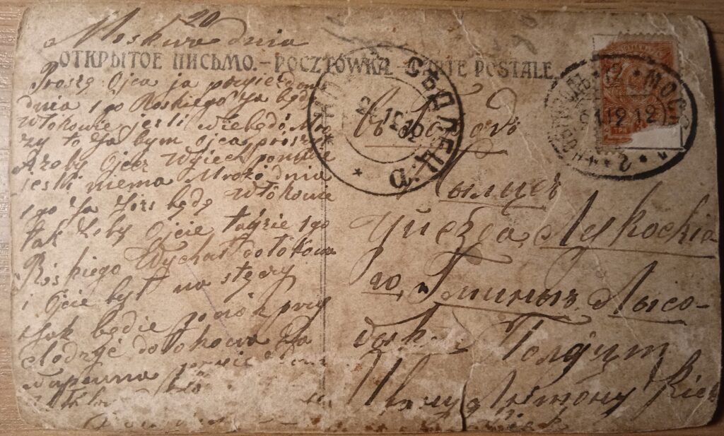 Karta wysłana do Antoniego Kijka z Łysobyk w 1910r. Prawdopodobnie syn wracał ze służby w wojsku carskim i prosił ojca o przyjazd po niego na stację kolejową w Łukowie „dnia 1 go Ruskiego”, czyli chyba w Nowy Rok wg kalendarza juliańskiego.