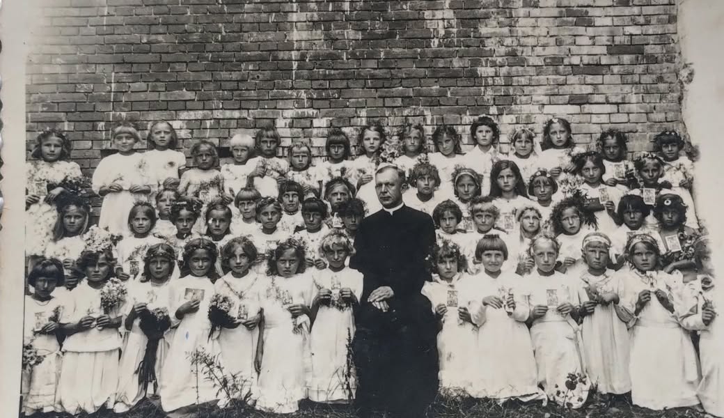 Zdjęcie wykonano 19 czerwca 1938r. przed kościołem w Łysobykach. Na zdjęciu ks. Jan Kazimierczak oraz dzieci z rocznika 1928, 1929 i zapewne starsze i młodsze. Zapraszam do odszukiwania swoich przodków. Czwarta dziewczynka w pierwszym rzędzie w lewo od księdza to Andzia Guz z Krepy, rocznik 1931. Górny rząd piąta dziewczynka od prawej to Maria Szabelska z „Draganów” z Łysobyk. Lewy górny róg Janina z domu Rozenkiewicz rocznik 1932.