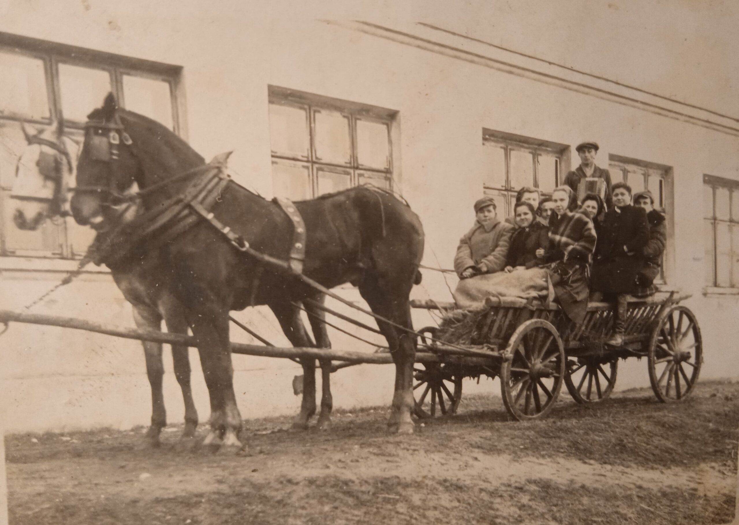 Przed szkołą w Przytocznie. Zdjęcie wykonano najprawdopodobniej między 1września 1941r. a majem 1945r. W tym czasie w szkole pracował Jan Pawłowski nauczyciel wysiedlony z okolic Poznania do Przytoczna. Pan Pawłowski trudnił się m.in. wykonywaniem fotografii. Przypuszczalnie widoczne osoby przyjechały do szkoły, aby zrobić sobie zdjęcia. Fotografię otrzymałam od mieszkańca Jeziorzan, dlatego sądzę, że sfotografowane osoby to mieszkańcy Łysobyk. Nie wiem, kim są. Według p. Wojciecha Długosza z Blizocina „konie są dworskie, najprawdopodobniej z Przytoczna. Widać że są to konie bardzo szlachetne, dość poprawnie zbudowane, ten na pierwszym planie trochę tylko łęgowaty, myślę że nikt w Łysobykach nie miał takiej pary. Dodatkowo uprząż, ogłowia z okularami, zdobienia metalowe na całości. Taka uprząż jak na tamte czasy paradna. Z Łysobyk uprzęże zawsze były powiązane na sznurki”.