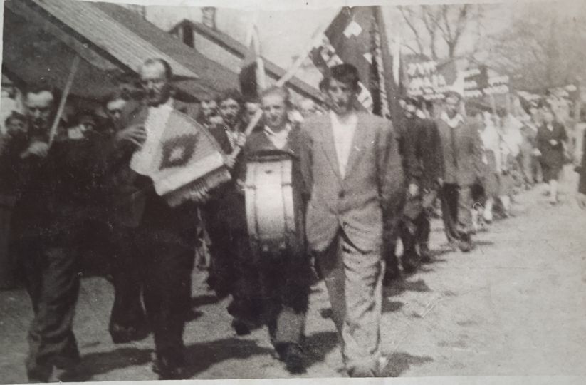 Łysobyki. Pochód pierwszomajowy. Od lewej: Brygoła – skrzypce, Józef Lemieszek – harmonia, Wiesław Lemieszek – bęben.