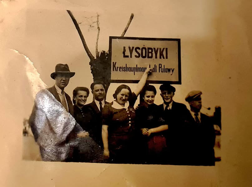 Na zdjęciu pracownicy Urzędu Gminy w Łysobykach, 1942r. Na drogowskazie informacja o przynależności gminy Łysobyki do powiatu puławskiego.