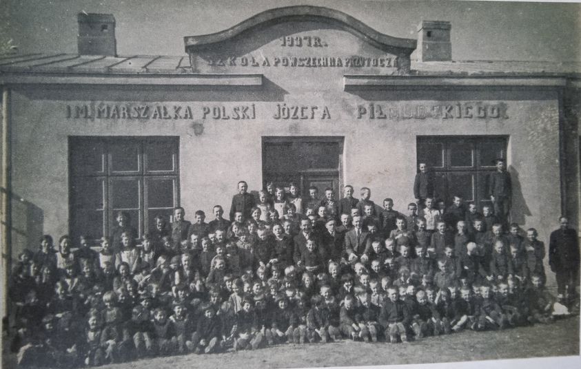 Tuż po wojnie. Uczniowie i nauczyciele przed szkołą w Przytocznie. Widoczne jest skuwanie napisu z imieniem patrona szkoły przez władze komunistyczne. Mężczyzna pierwszy od prawej to woźny Niedziela. Wśród kadry nauczycielskiej jest nauczyciel Guźniczak. Gużniczak Jan rozpoczął pracę w szkole 1 września 1945r jako kierownik szkoły. Był repatriantem z Litwy z powiatu wileńsko-trockiego. Obok obowiązków wynikających z pełnienia funkcji kierownika szkoły uczył także dzieci – 7 godzin dziennie lekcji z dziećmi. To przeciążenie pracą wynikało z braku kadry nauczycielskiej. We wrześniu pracę rozpoczęło dwóch nauczycieli: p. Guźniczak i Michał Mich (mieszkał z rodziną w Blizocinie), zaś do szkoły uczęszczało 210 dzieci. Kiedy Jan Guźniczak przybył do Przytoczna, nie mógł znaleźć mieszkania do wynajęcia. Zamieszkał w budynku szkolnym w jednej z izb lekcyjnych. Wójt gminy Łysobyki obiecał przysposobić to pomieszczenie na mieszkanie, ale ograniczono się tylko do wymurowania pieca kuchennego. Prace przeciągały się, dlatego p. Guźniczak gotował posiłki na podwórku na ognisku aż do końca października 1945r. Nikt z mieszkańców nie udostępnił mu wtedy piecyka żelaznego. Myślę, że taka postawa mieszkańców wynikała z ogromnej biedy ówczesnej wsi.